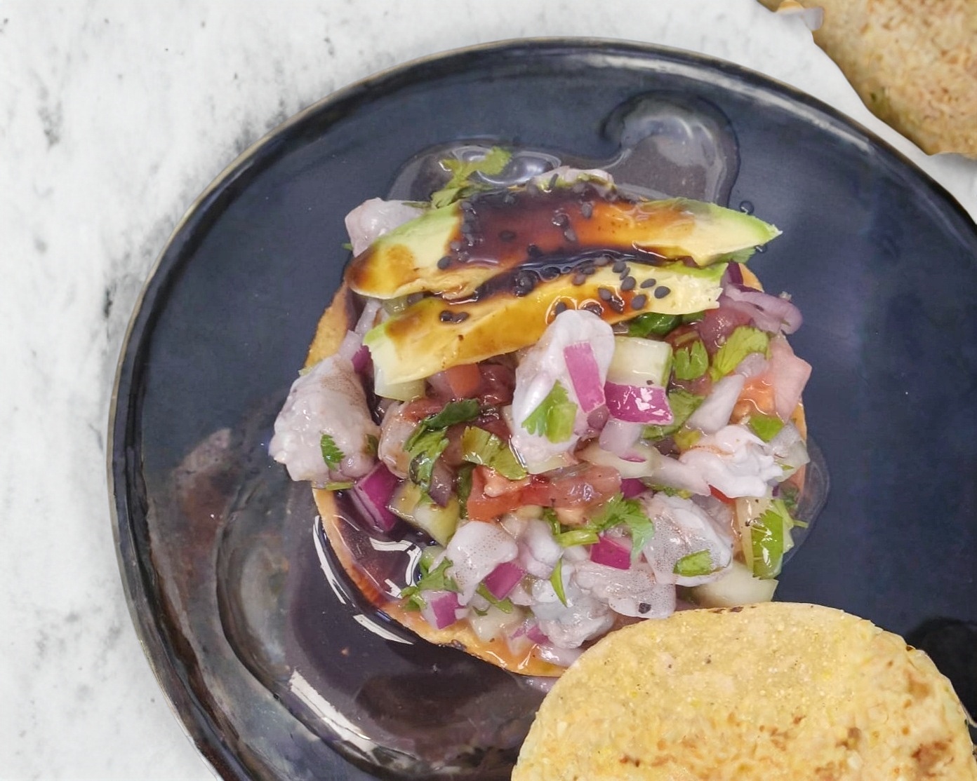 Cuatro quesadillas de maiz con camarones acompañadas de salsa y verduras.
