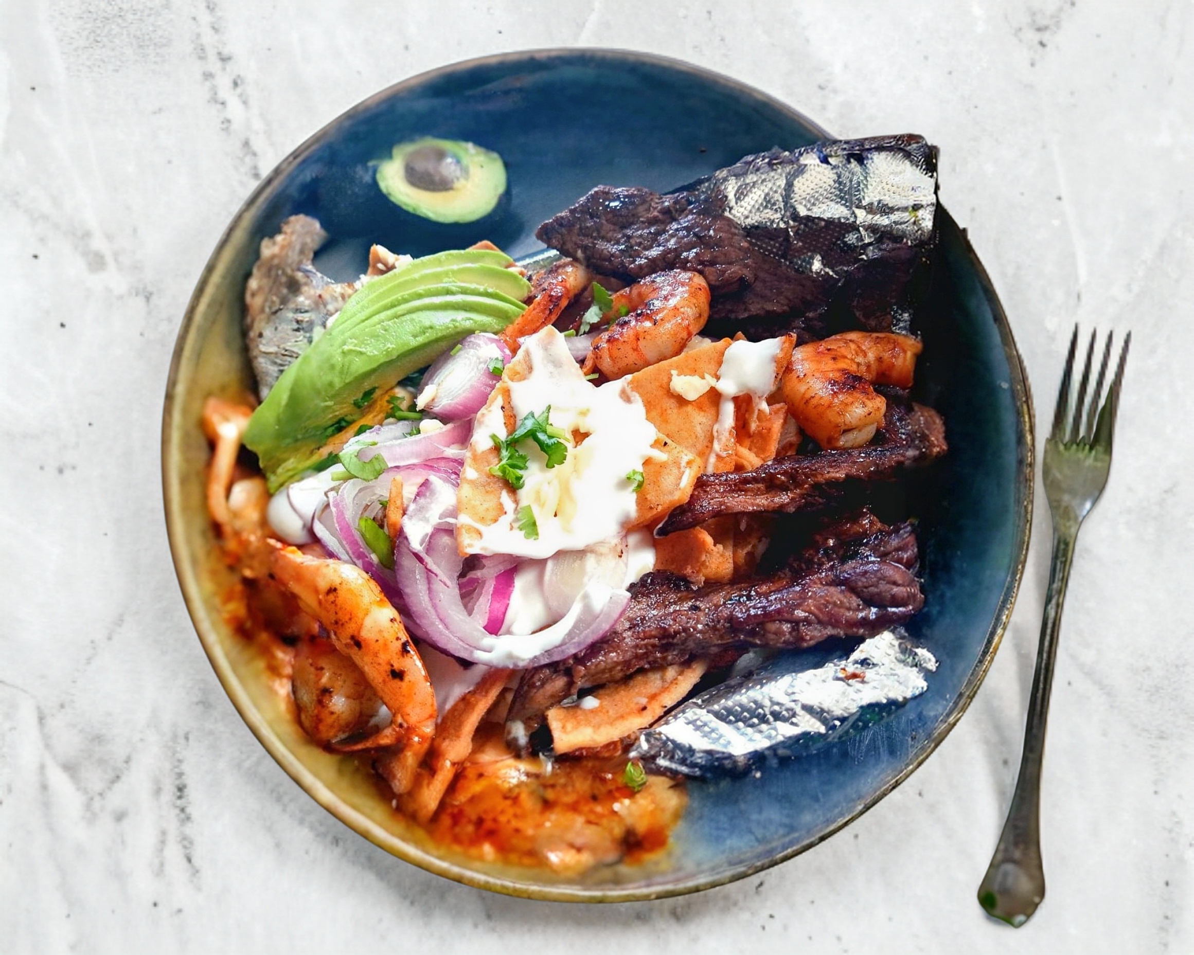 Totopos 100% caseros, con la salsa de tu elección, queso menonita, birria de res, un huevo estrellado montado, acompañados de cilantro, cebolla y crema.