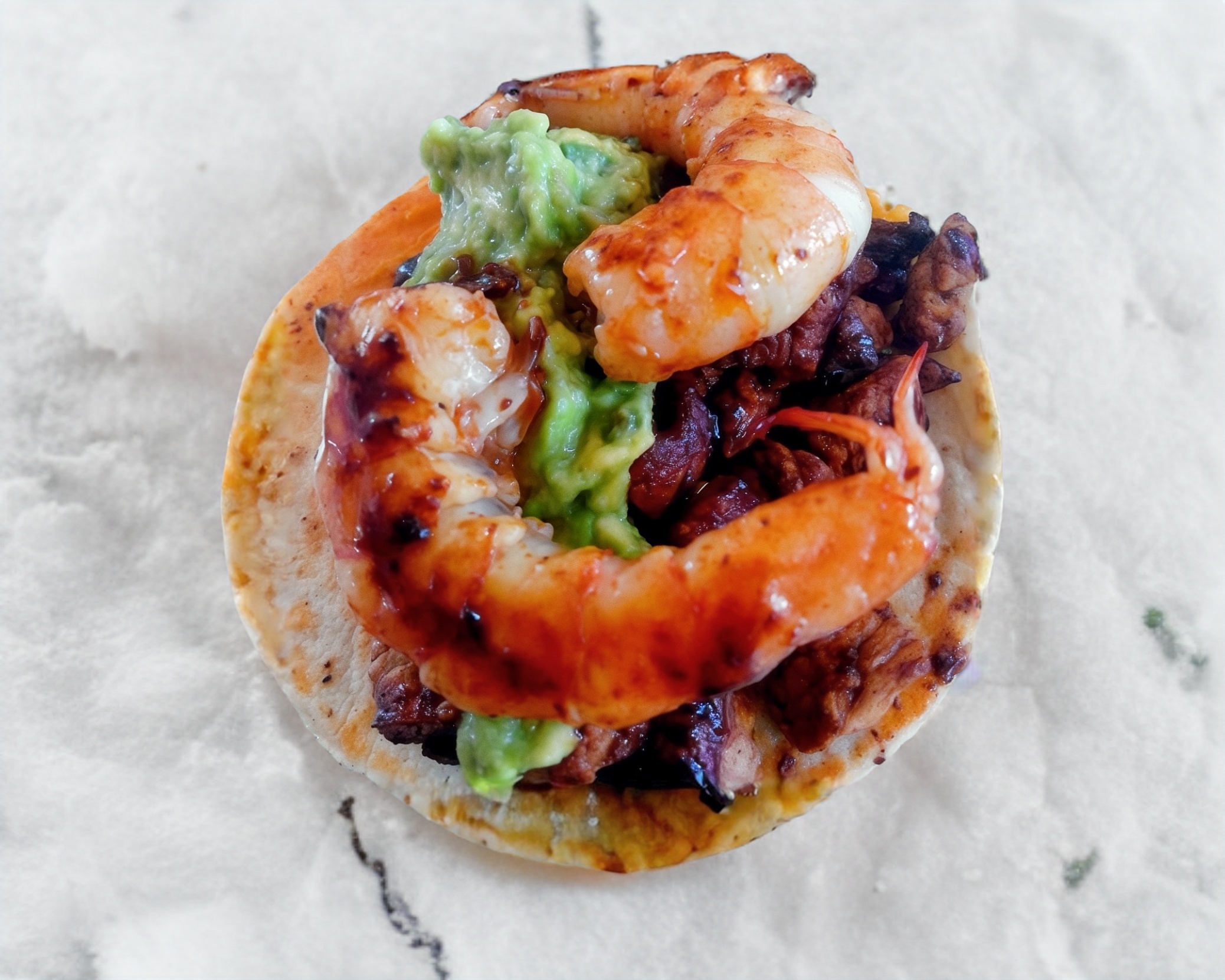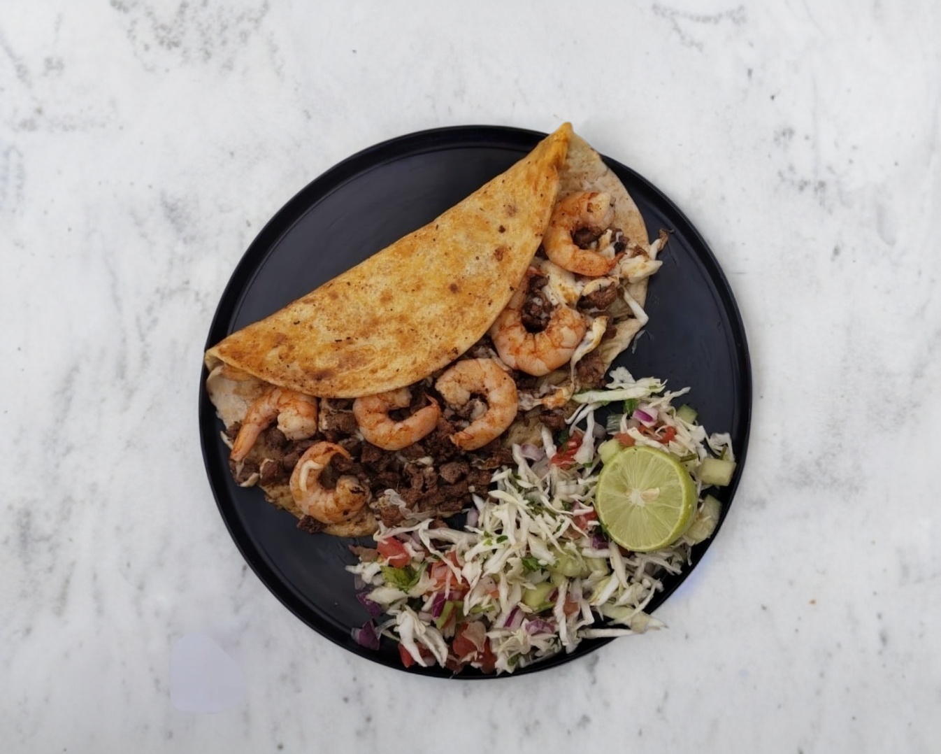 Un taco grande de camarones salteados con carne asada, acompañados de salsa, verdura y limones.