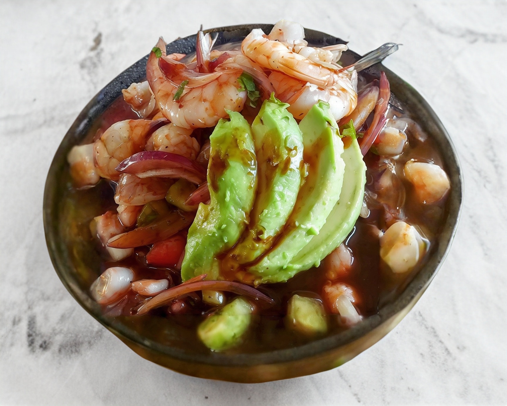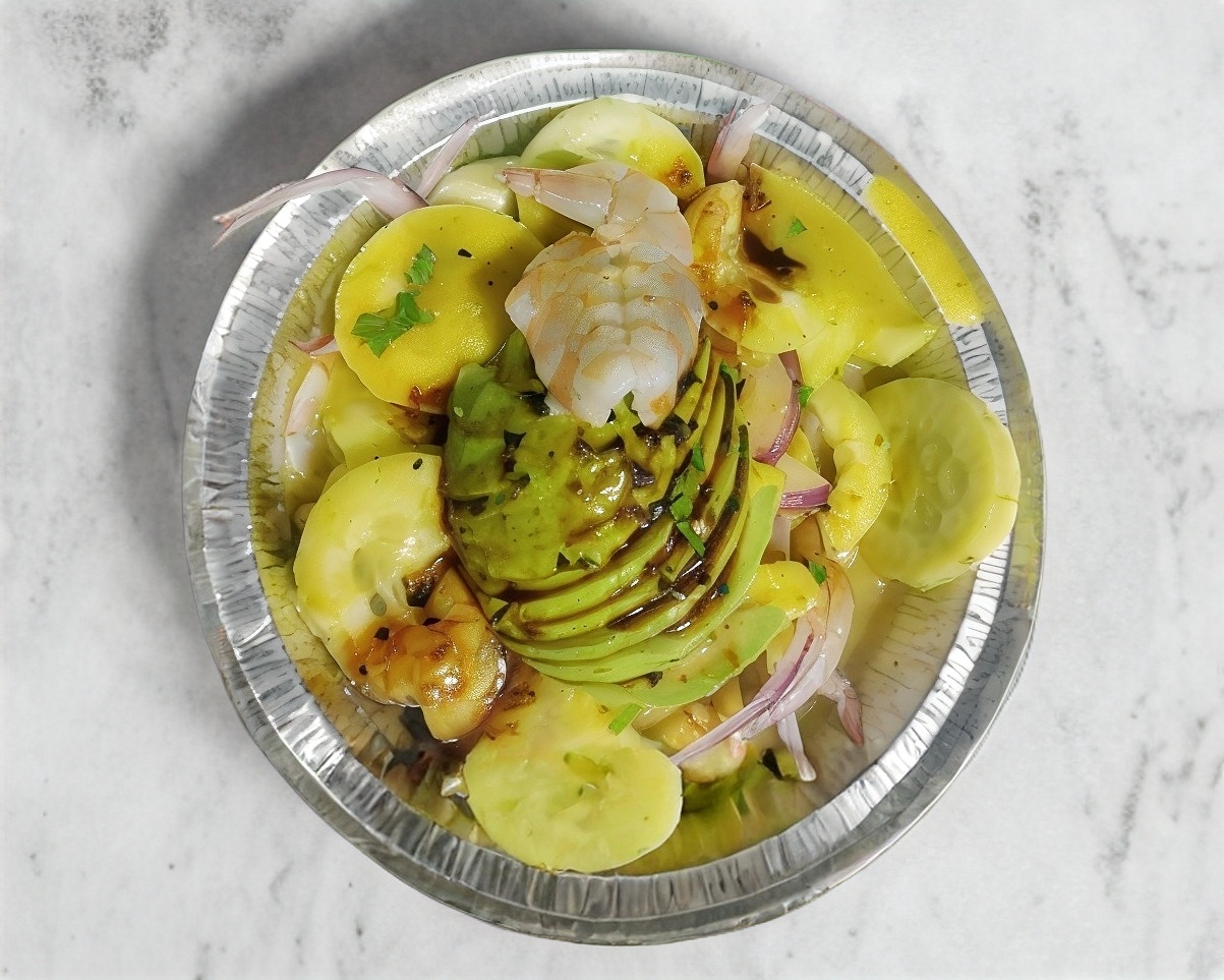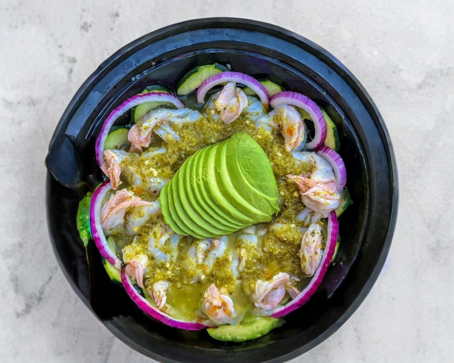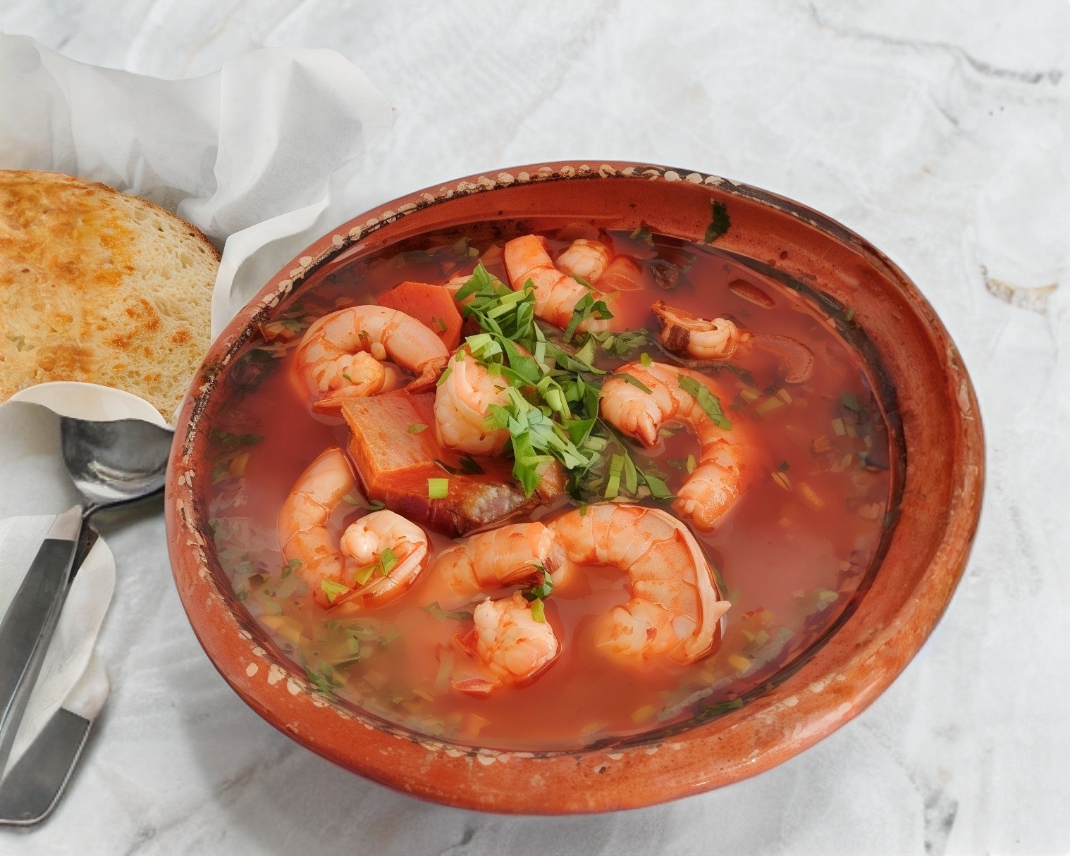 Un litro de caldo bien caliente de 15 grandes camarones, cilantro, cebolla, zanahoria, salsa de la casa con sazon.