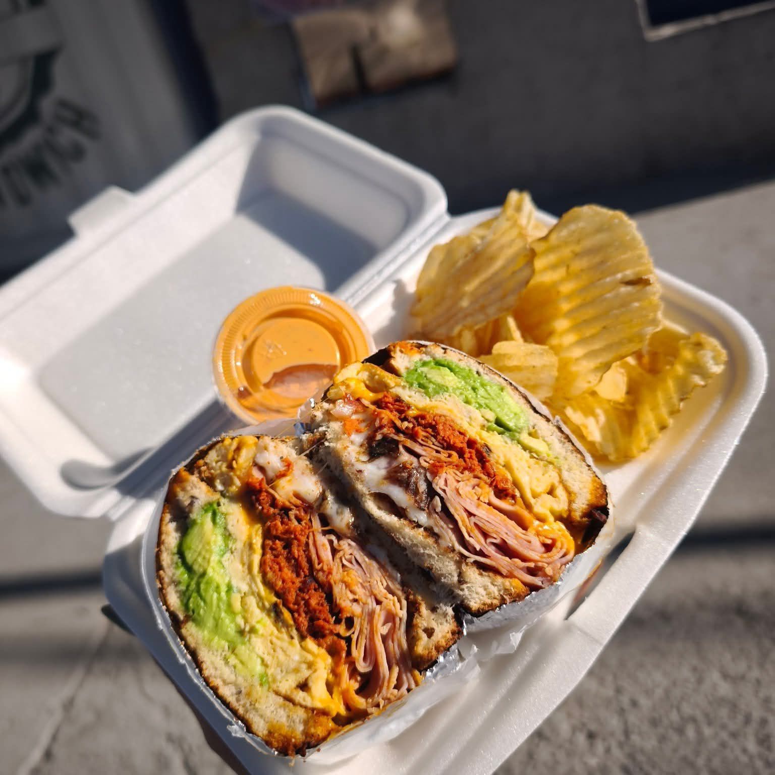 Huevito, queso cheddar, queso blanco, jamón, lechuga, tomate, mayonesa y aguacatito.