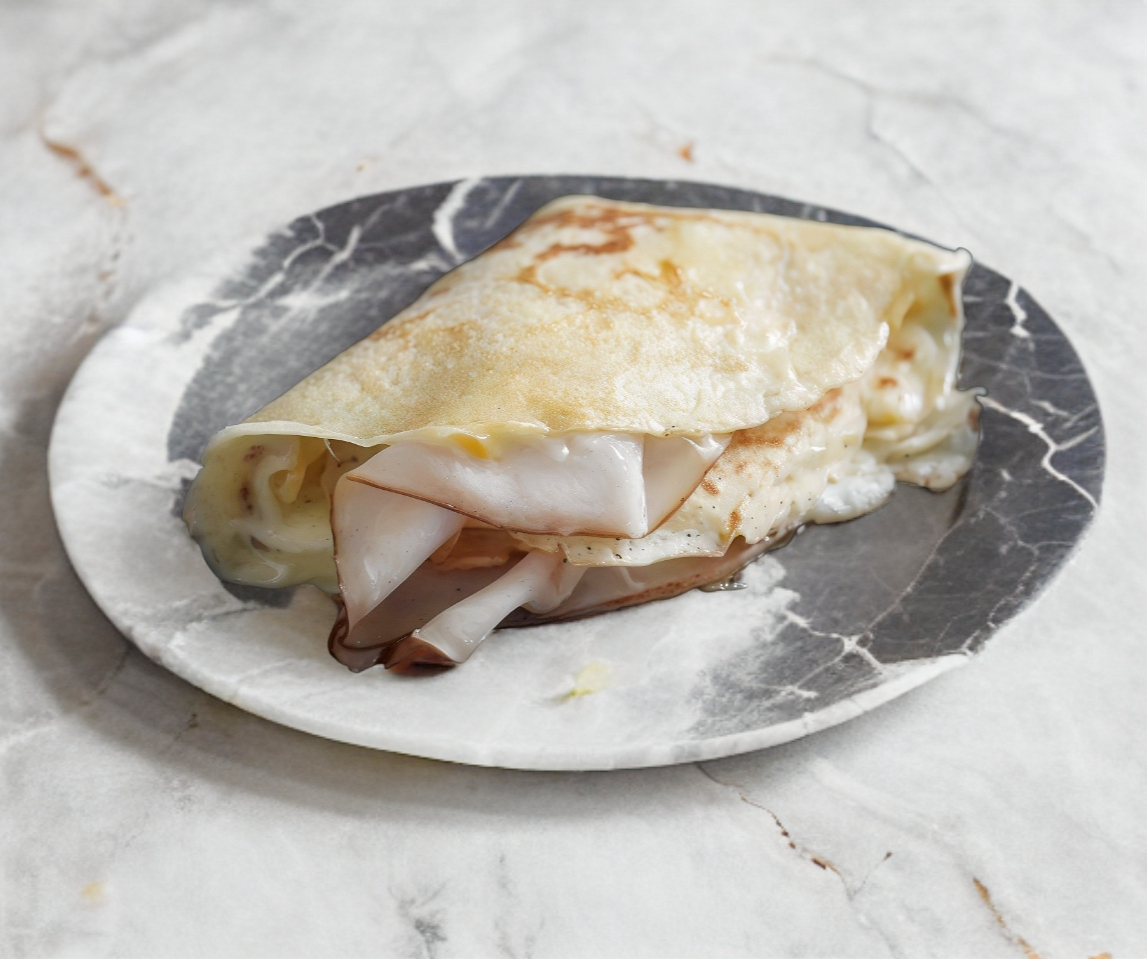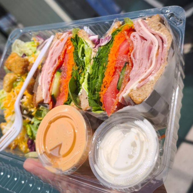 Sandwich de pechuga de pavo y jamón acompañado de ensalada con salsa & aderezo en porción separada.