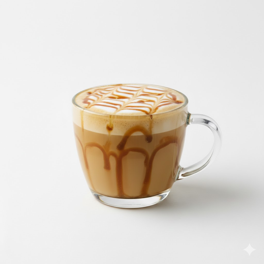 Latte con jarabe de caramelo , leche entera & espresso.
