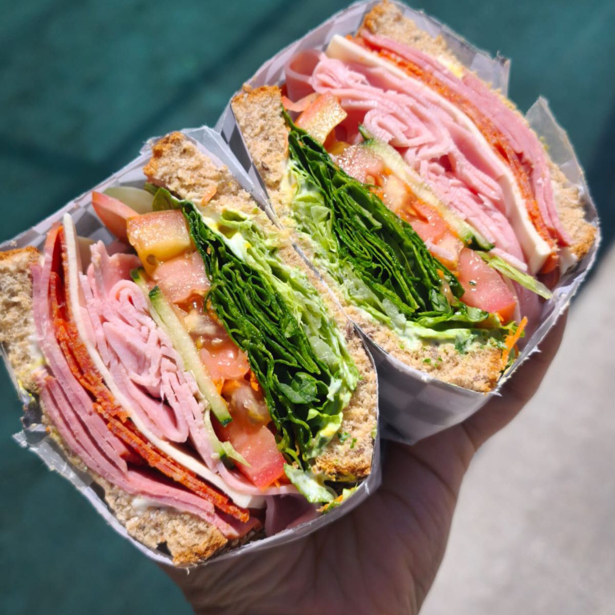 Sandwich con jamón, salami, peperroni acompañado de ensalada.