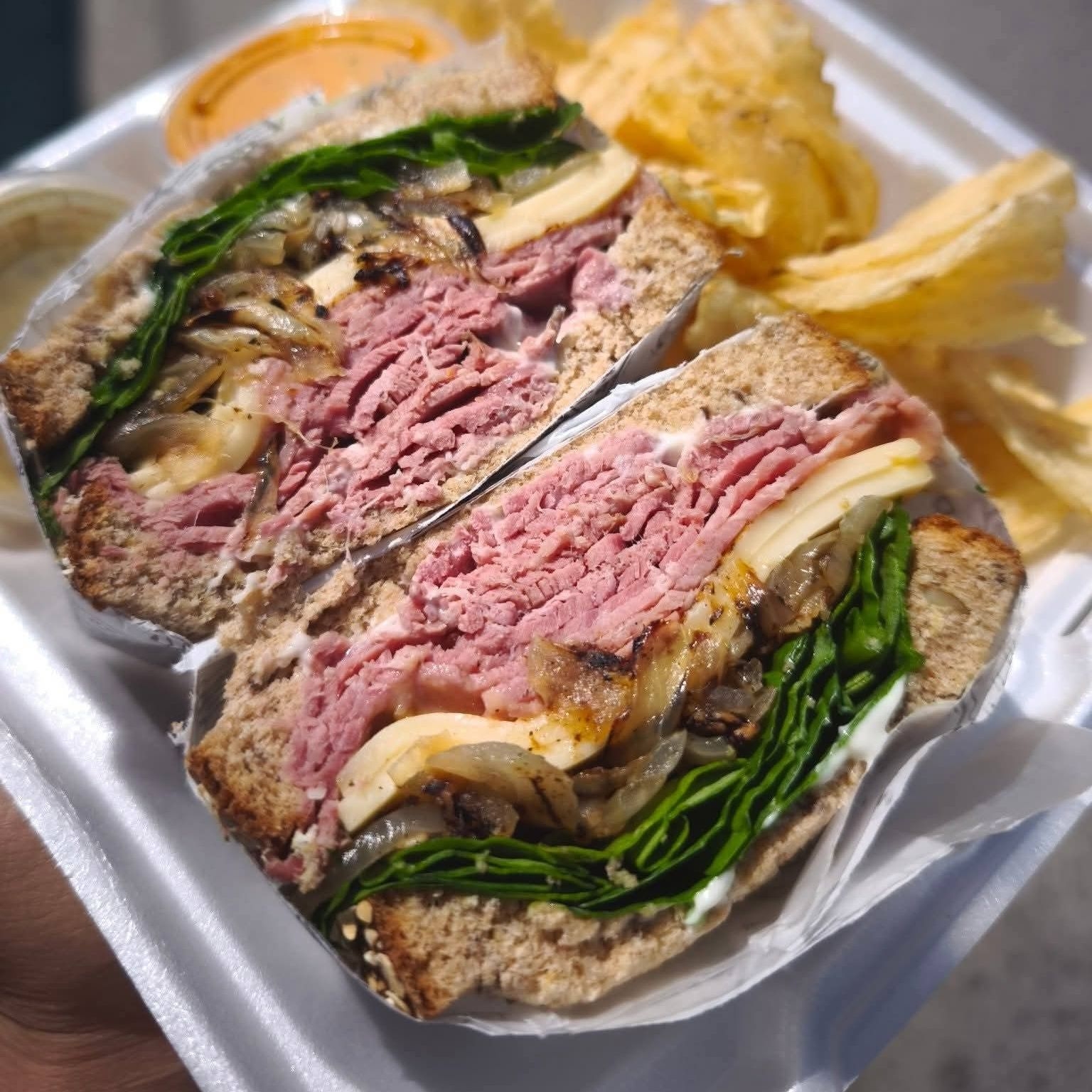 Sándwich caliente de carne de res con cebolla , doble queso blanco , espinaca y líquidos.