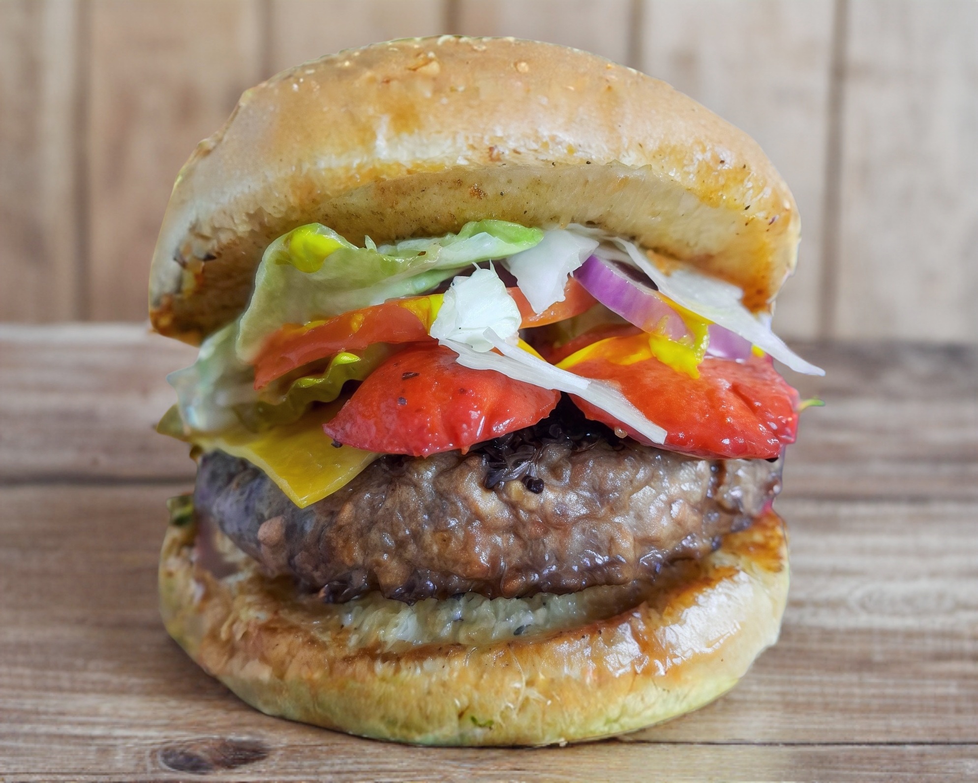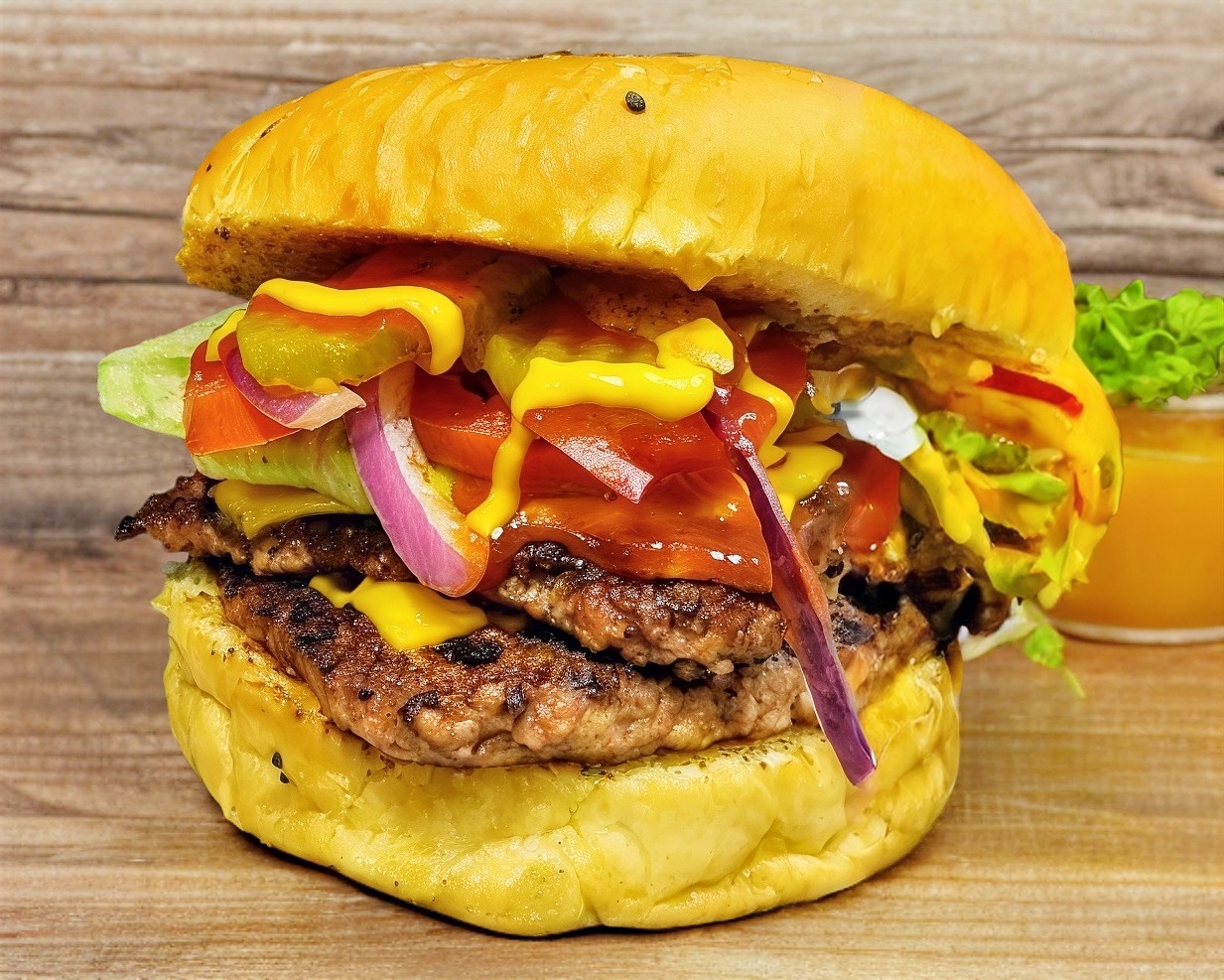 Hamburguesa con 2 carnes de 100 g, queso americano, lechuga, tomate, cebolla morada, pepinillos, cátsup, mostaza y mayonesa.