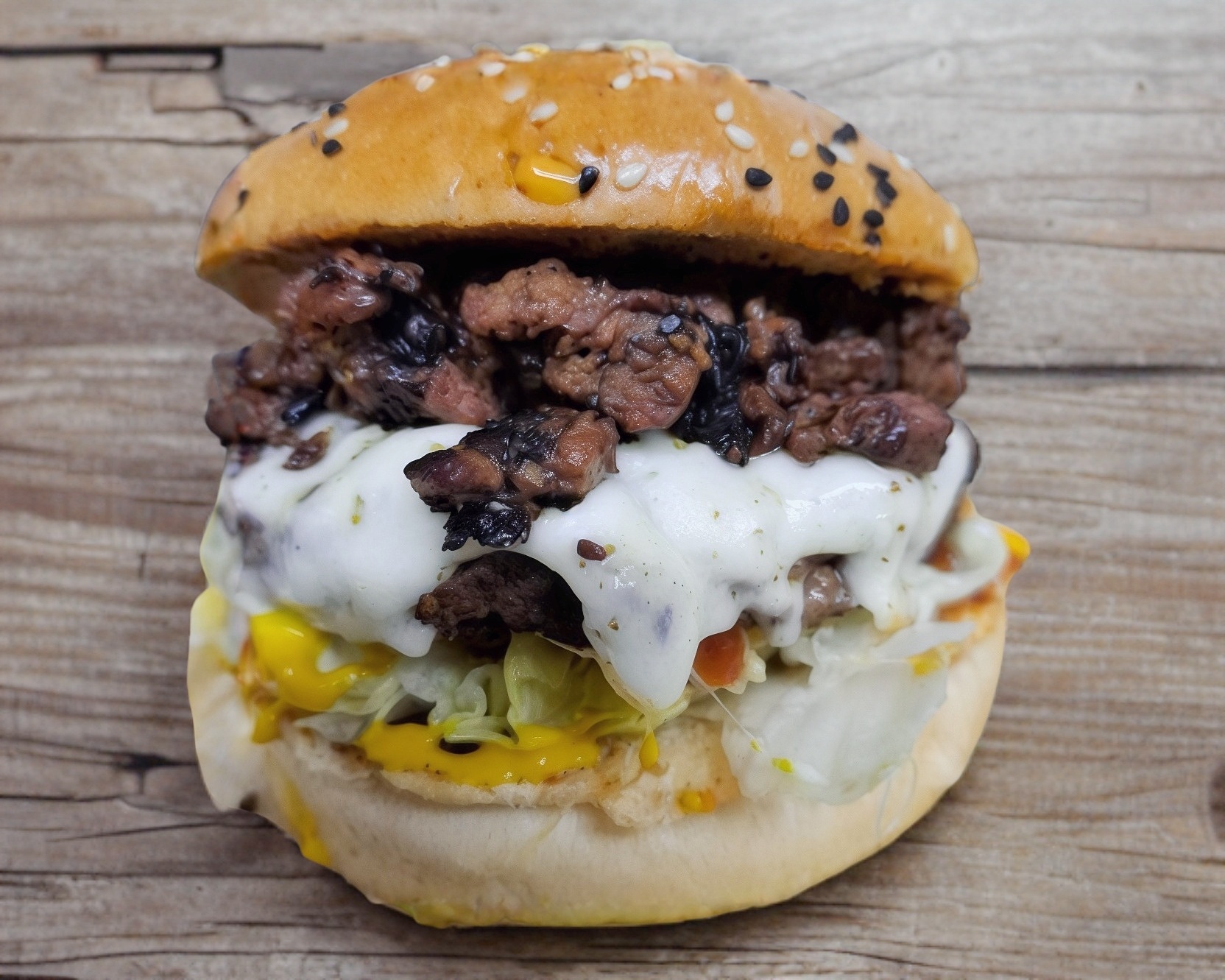 Carne de sirloin 225 g, queso americano, lechuga, tomate, cebolla morada, pepinillos, cátsup, mostaza y mayonesa.