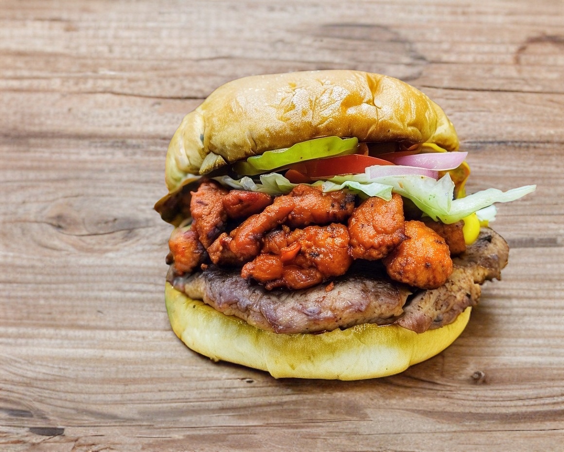 Hamburguesa con pechuga de pollo natural crujiente, bañado en salsa louisiana, queso americano, lechuga, tomate, cebolla morada, pepinillos, cátsup, mostaza y mayonesa.