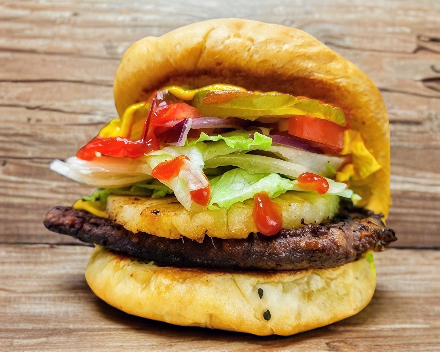 Carne de 100 g, piña, jamón, queso americano, lechuga, tomate, cebolla morada, pepinillos, cátsup, mostaza y mayonesa.