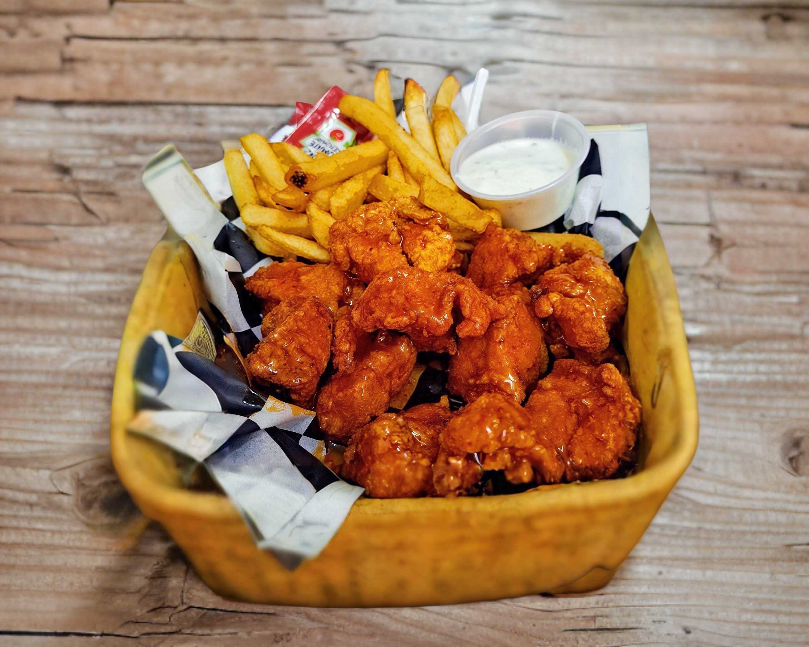 200 g De boneless de pechuga 100% natural, sazonados y empanizados al momento, bañados en tu salsa favorita, papas, aderezo y cátsup.