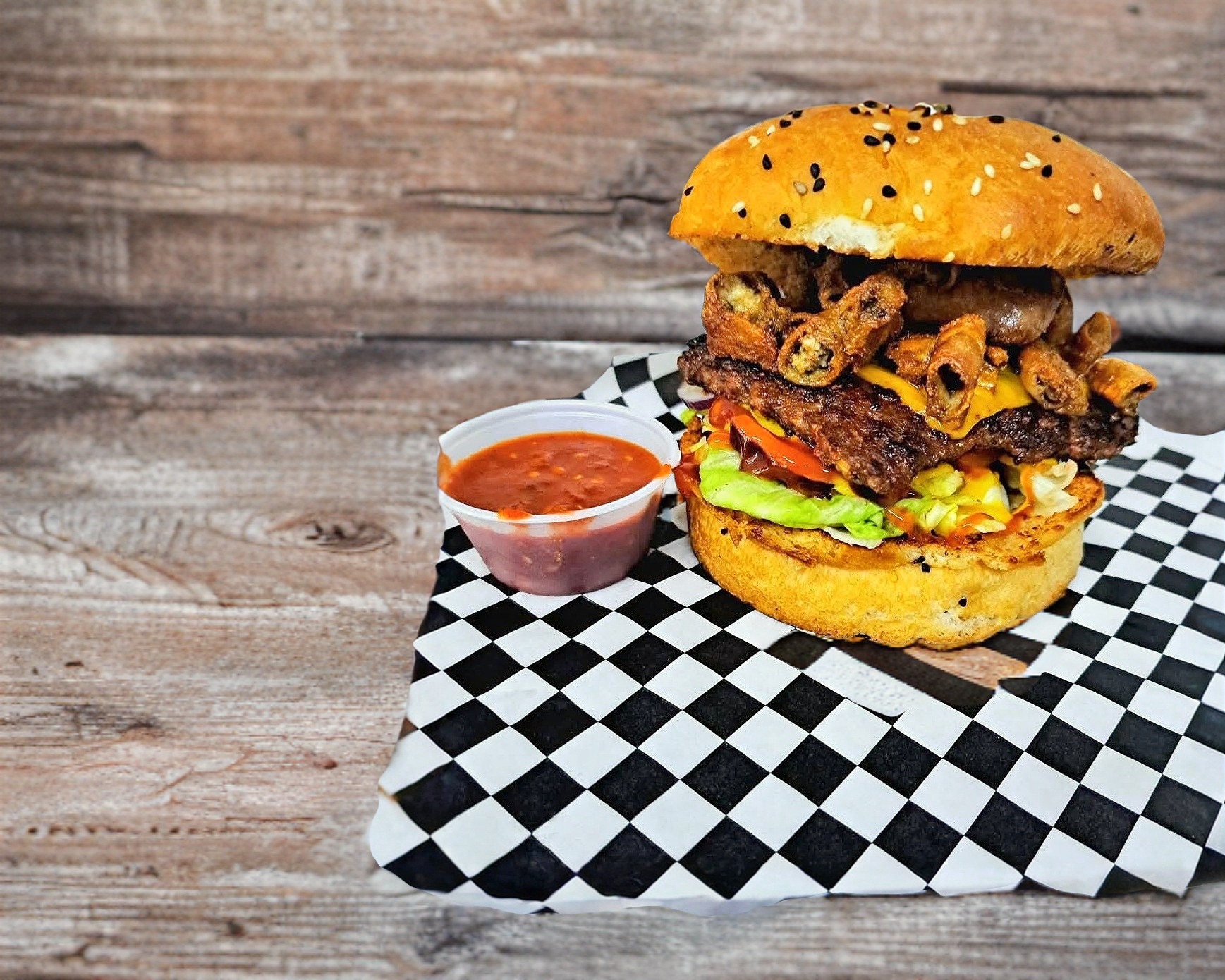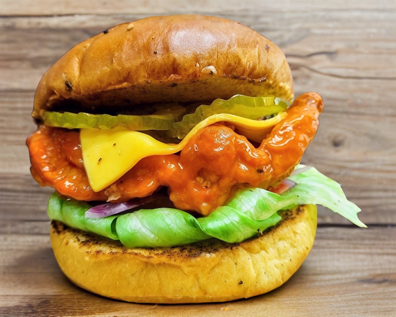 Hamburguesa con pechuga de pollo natural crujiente, bañado en salsa buffalo, queso americano, lechuga, tomate, cebolla morada, pepinillos, cátsup, mostaza y mayonesa.