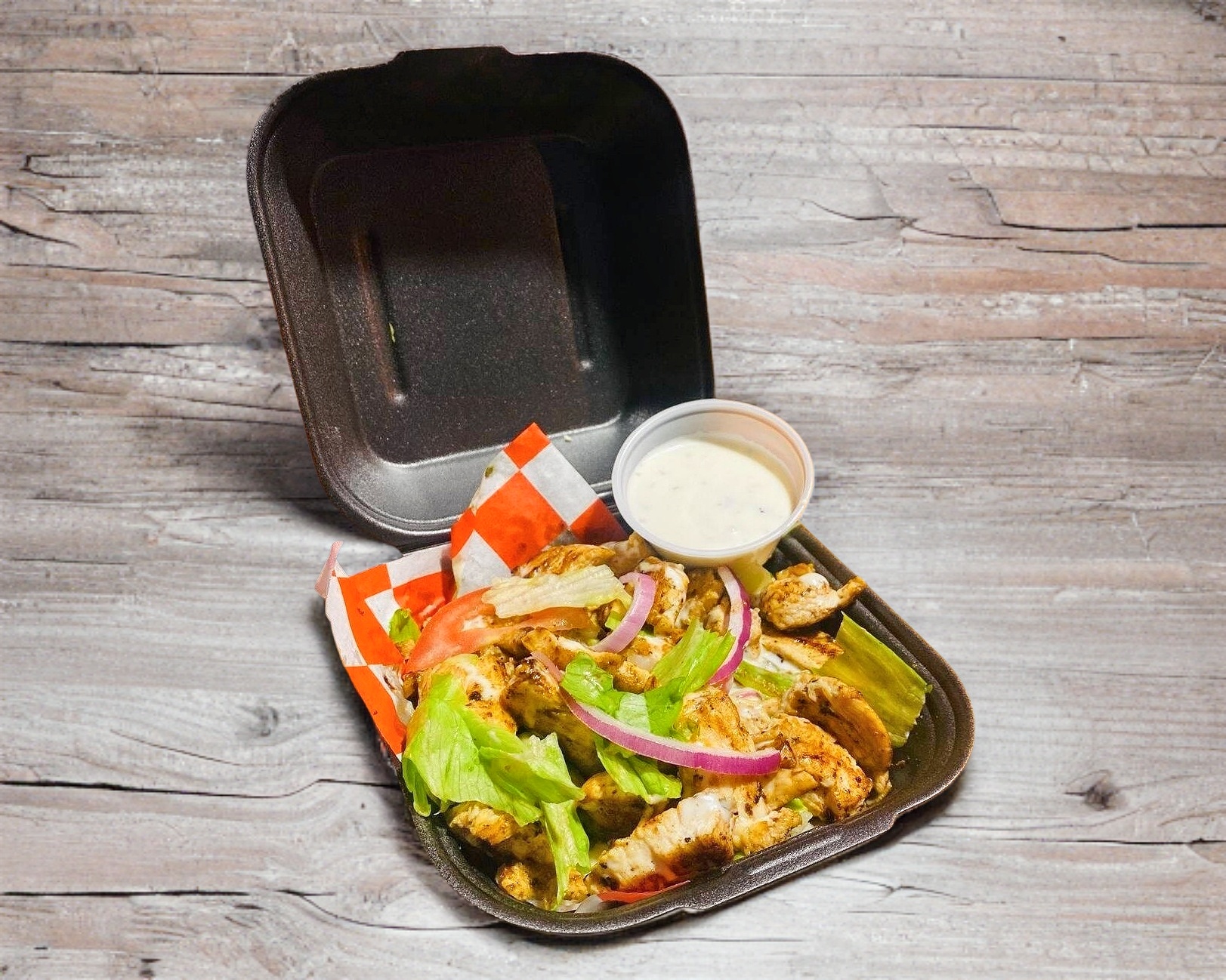 150 g De pechuga de pollo, lechuga, tomate, cebolla morada y aderezo ranch.