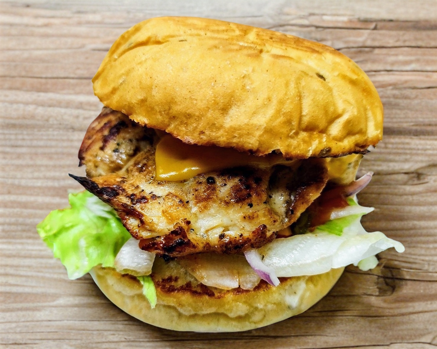 Hamburguesa con pechuga de pollo natural crujiente, queso americano, tomate, cebolla morada, pepinillos, cátsup, mostaza y mayonesa.