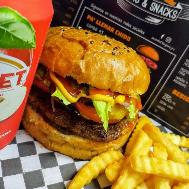Hamburguesa con pechuga 100% natural, preparada a la plancha, bañada en salsa mango habanero, lechuga, tomate, cebolla morada, pepinillos, cátsup, mostaza y mayonesa.