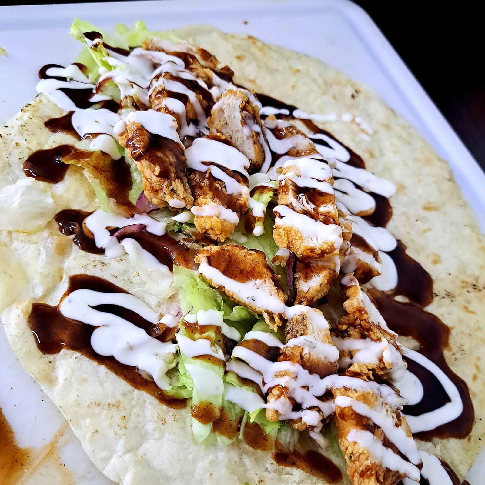 Pechuga de pollo crujiente, lechuga, tomate, cebolla, aderezo, todo envuelto en una tortilla de harina.