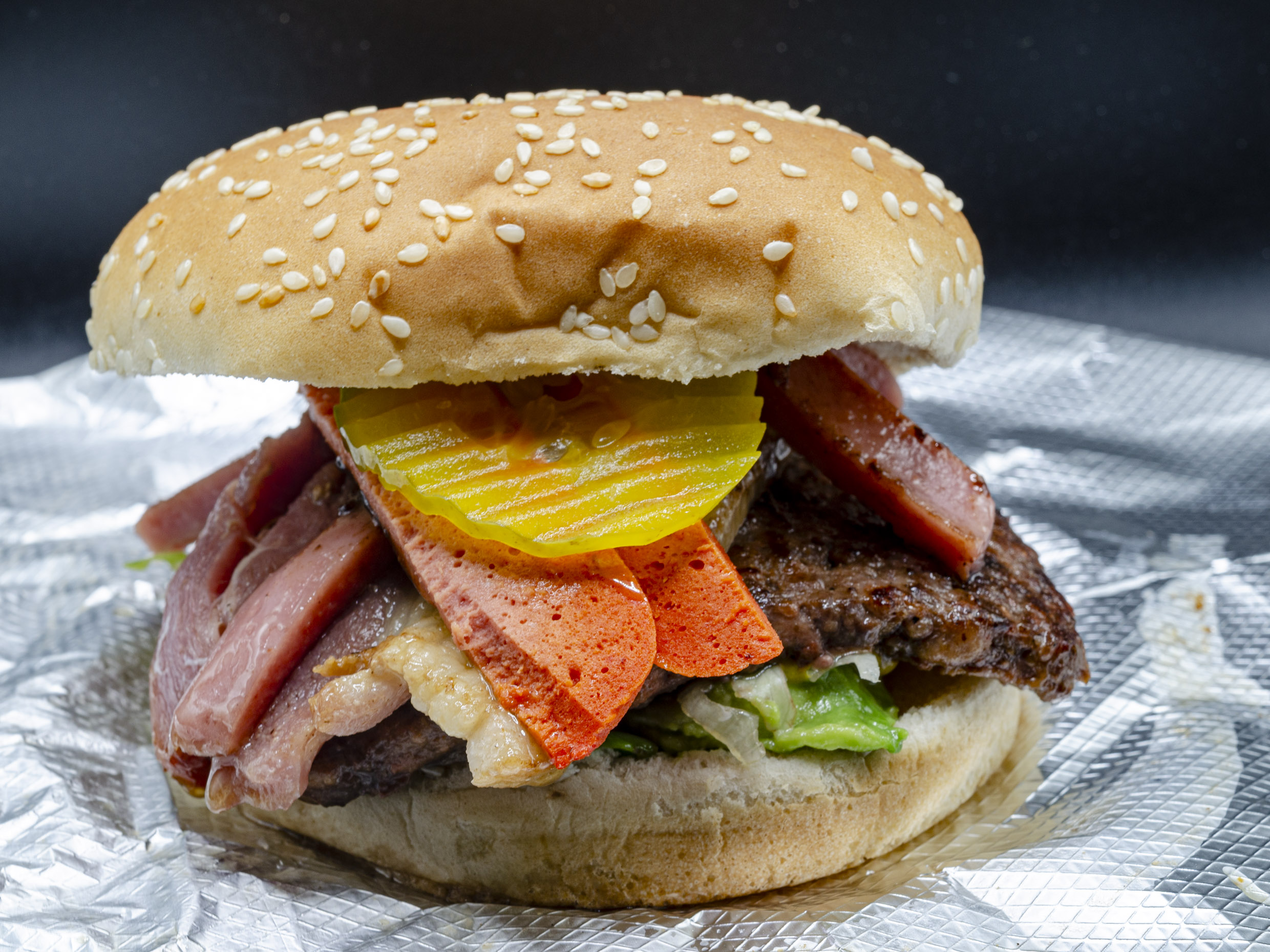 Carne, Queso, Lechuga, Tomate, Pepinillo, Cebolla, Mayonesa, Mostaza, Catsup, winnie, Piña, Aguacate