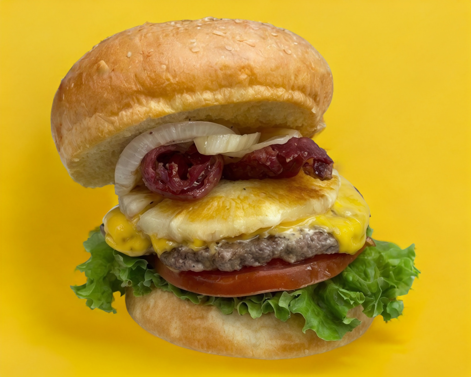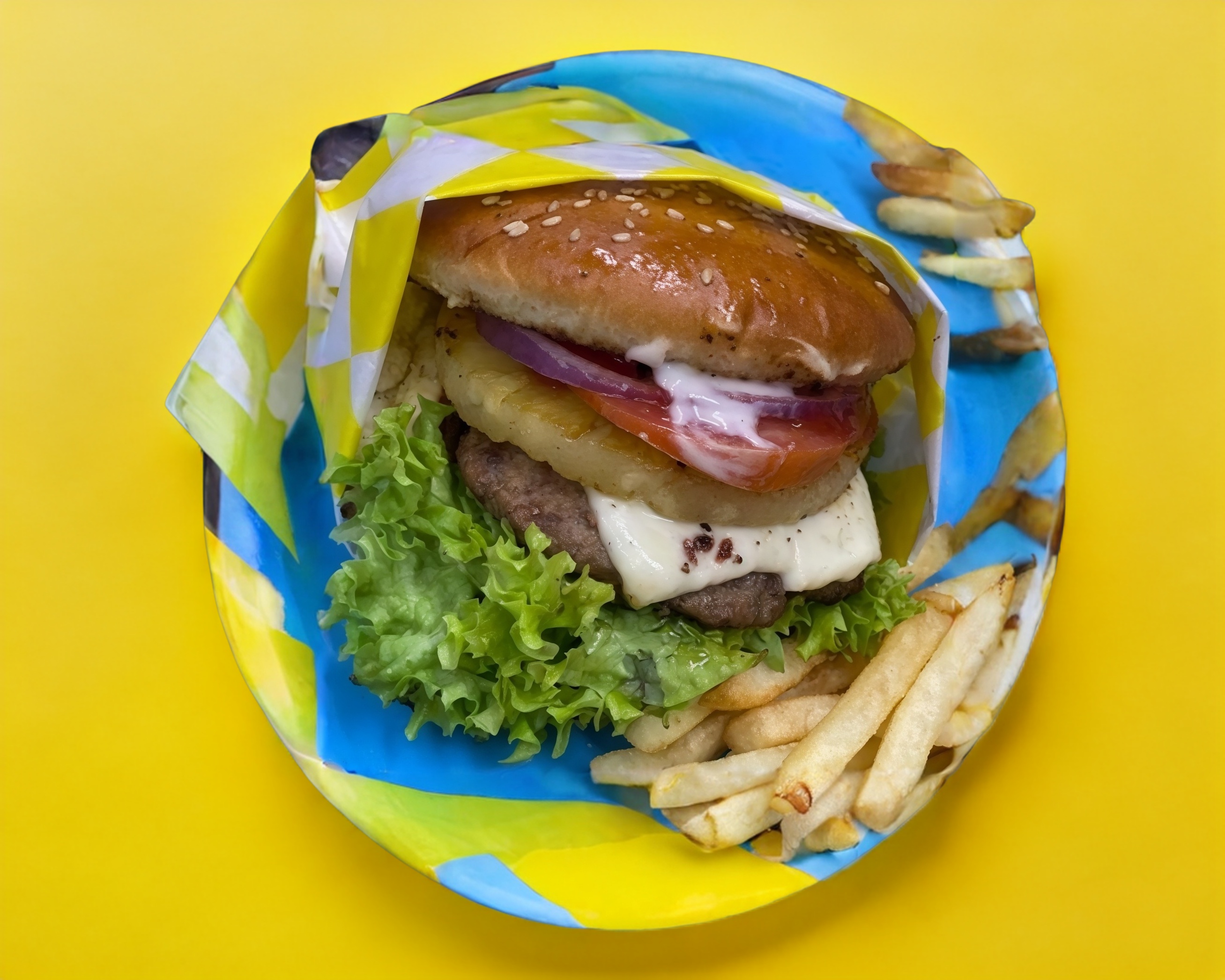 Carne de res, pan de la casa brioche, queso, cebolla morada, tomate , lechuga, pepino, aderezo de la casa y piña.