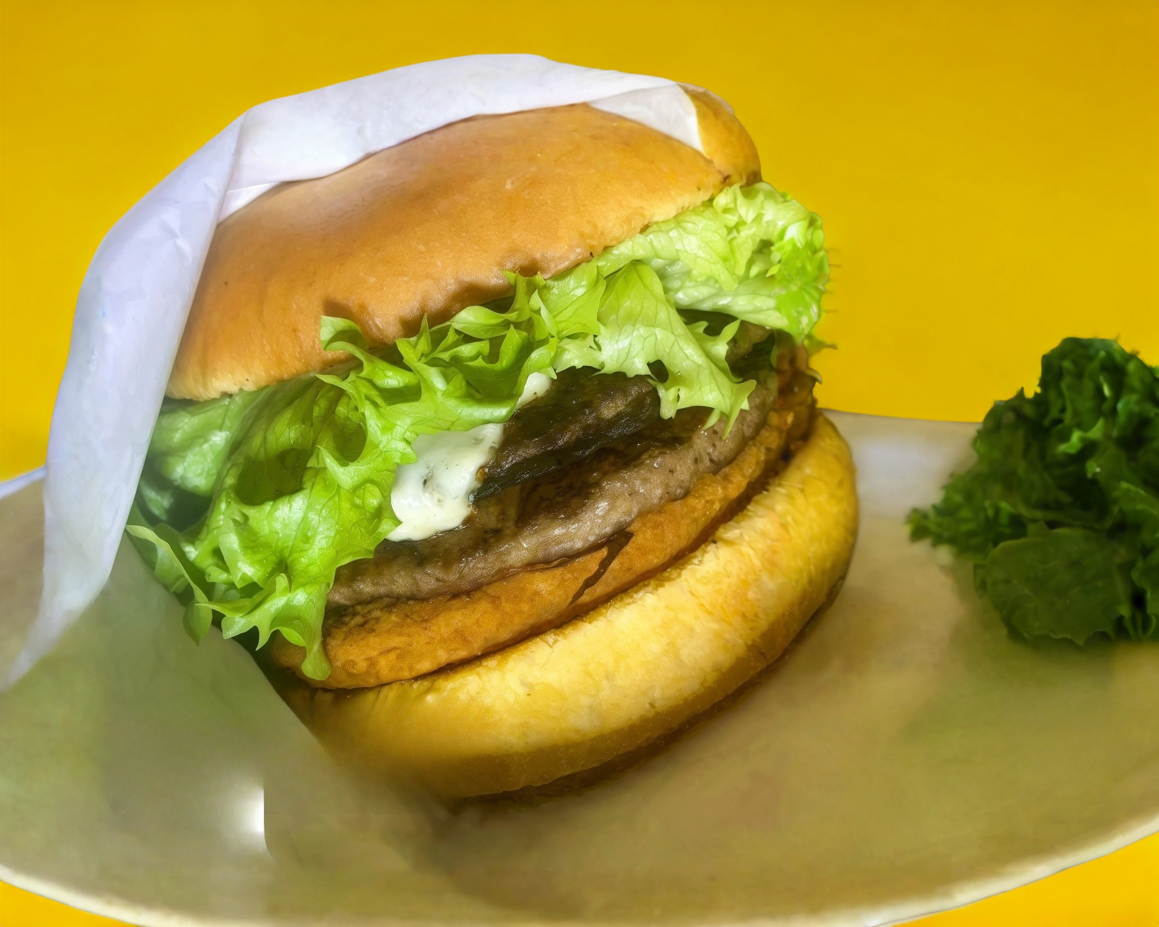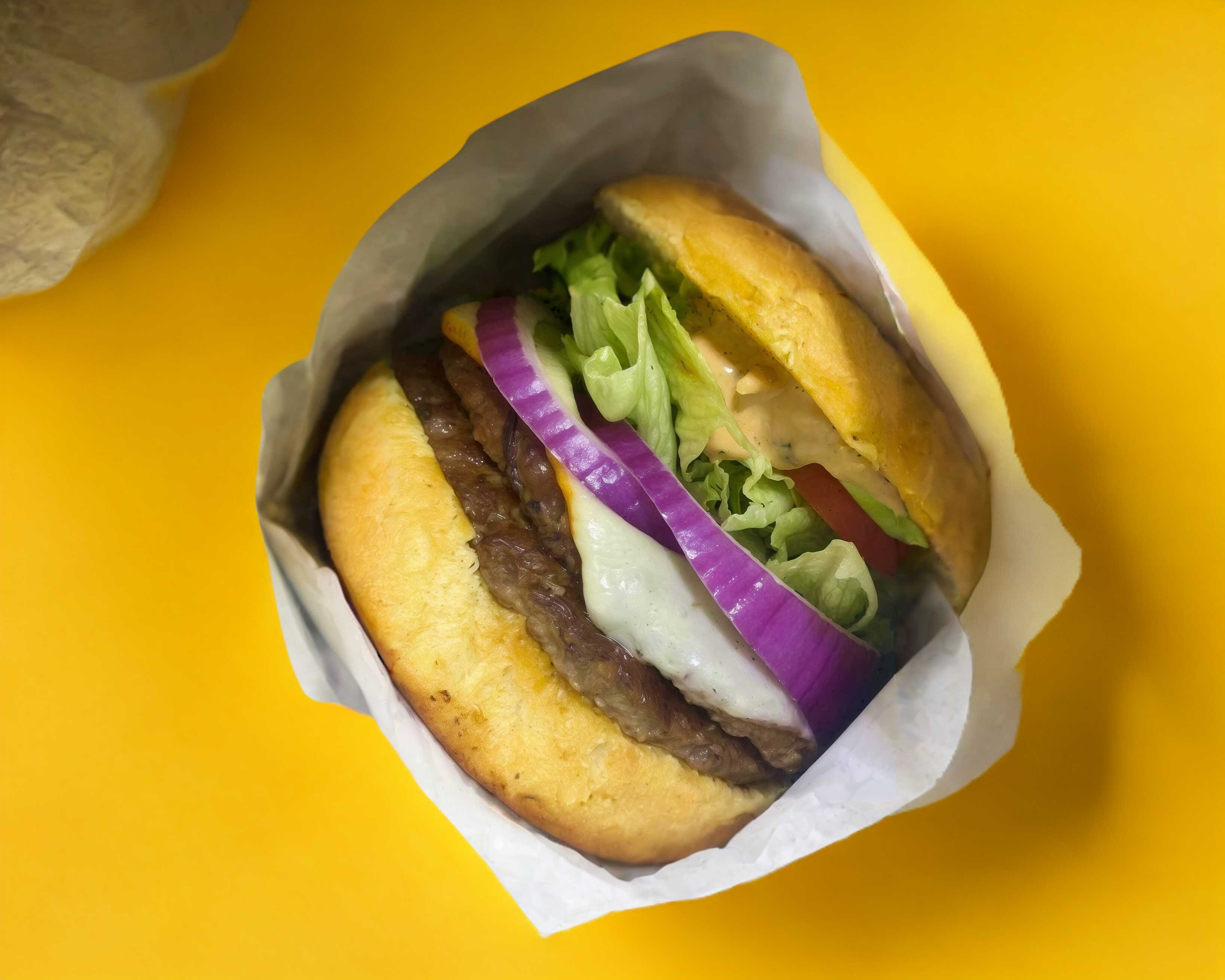 Doble carne de res ,pan de la casa brioche, queso, cebolla morada, lechuga, tomate pepino y aderezo de la casa.
