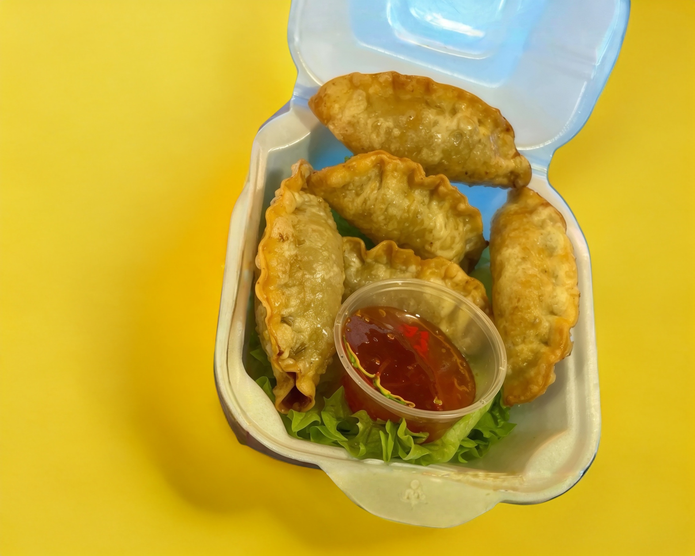 Plato Mix Boneles: 4 dumpling 🥟, 4 aros de cebolla , papas fritas