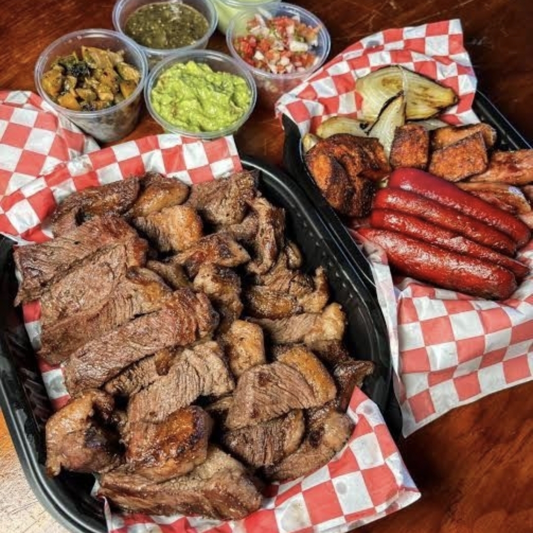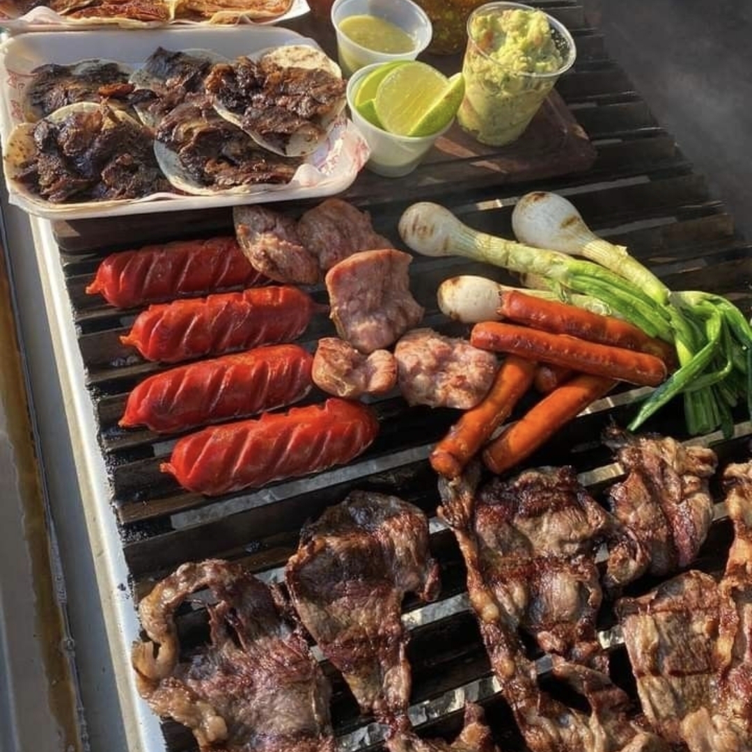 1kg de carne de res, cebollas, salchichas, tortillas, salsas volcanes, 2 frijoles charros de 3 a 5 personas