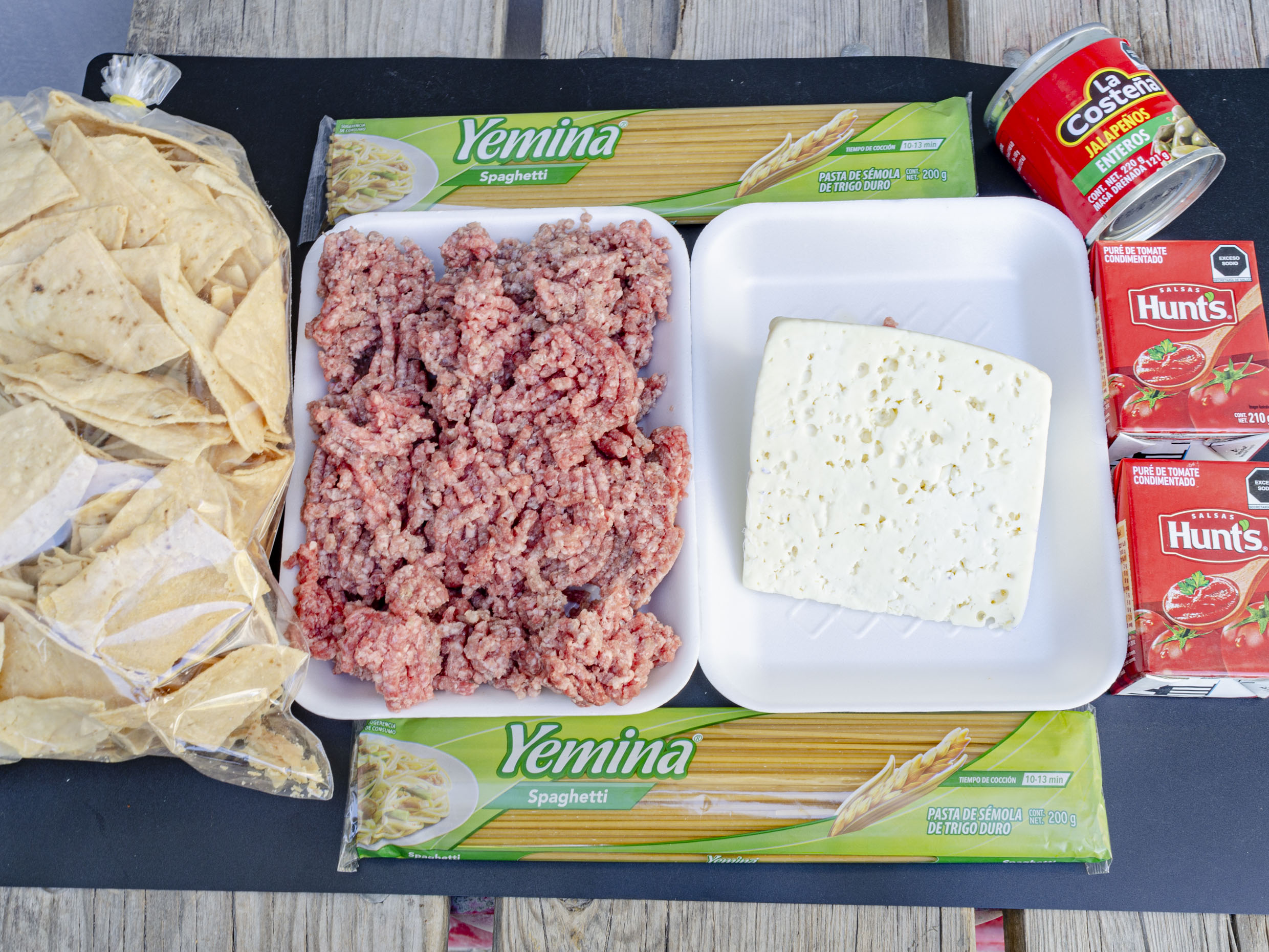 2 Paq. Spagueti Yemina, 2 Pure de Tomate, 500g Molida, 250g Queso, 1 Bolsa de Totopos Caseros, 1 latita de Jalapeños