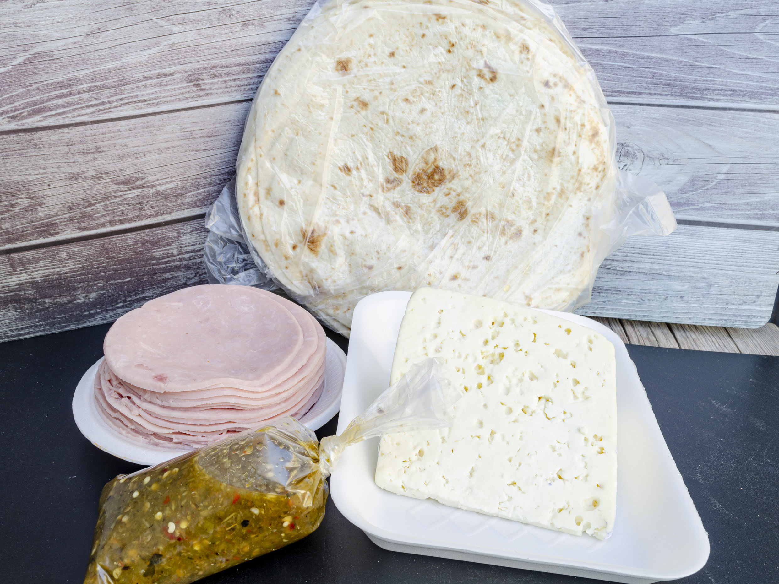 1 Paq. Tortillas Harina, 500g Queso Menonita, 500g Jamon, 1 Salsa Casera