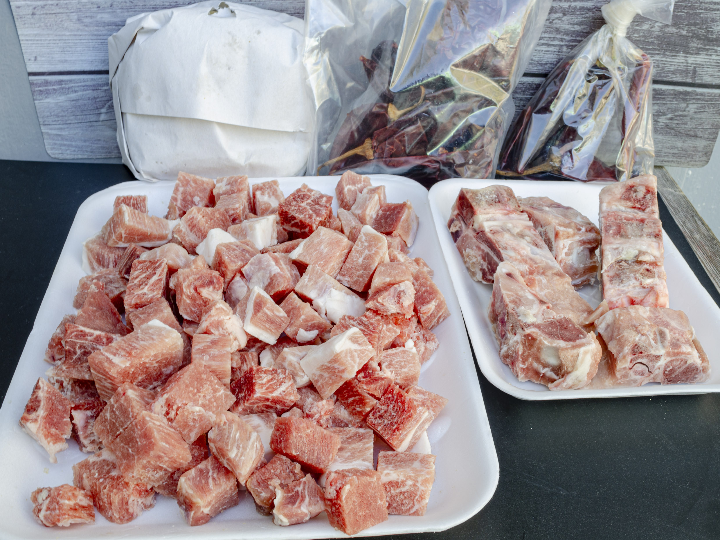 1Kg Puerco Picado, 500g Espinazo, .116g Chile Colorin, .055g Chile Mirasol, 1 Paq. Tortillas Maiz