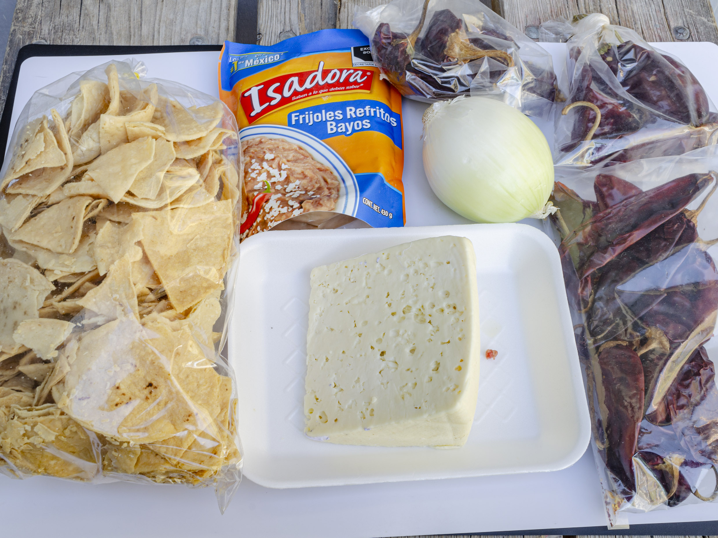 1 Bolsa de Totopos Caseros, .090g Chile mirasol, 116g Chile Colorin, 250g Queso, 1 Cebolla y 1 Bolsa de Frijoles Isadora 430g