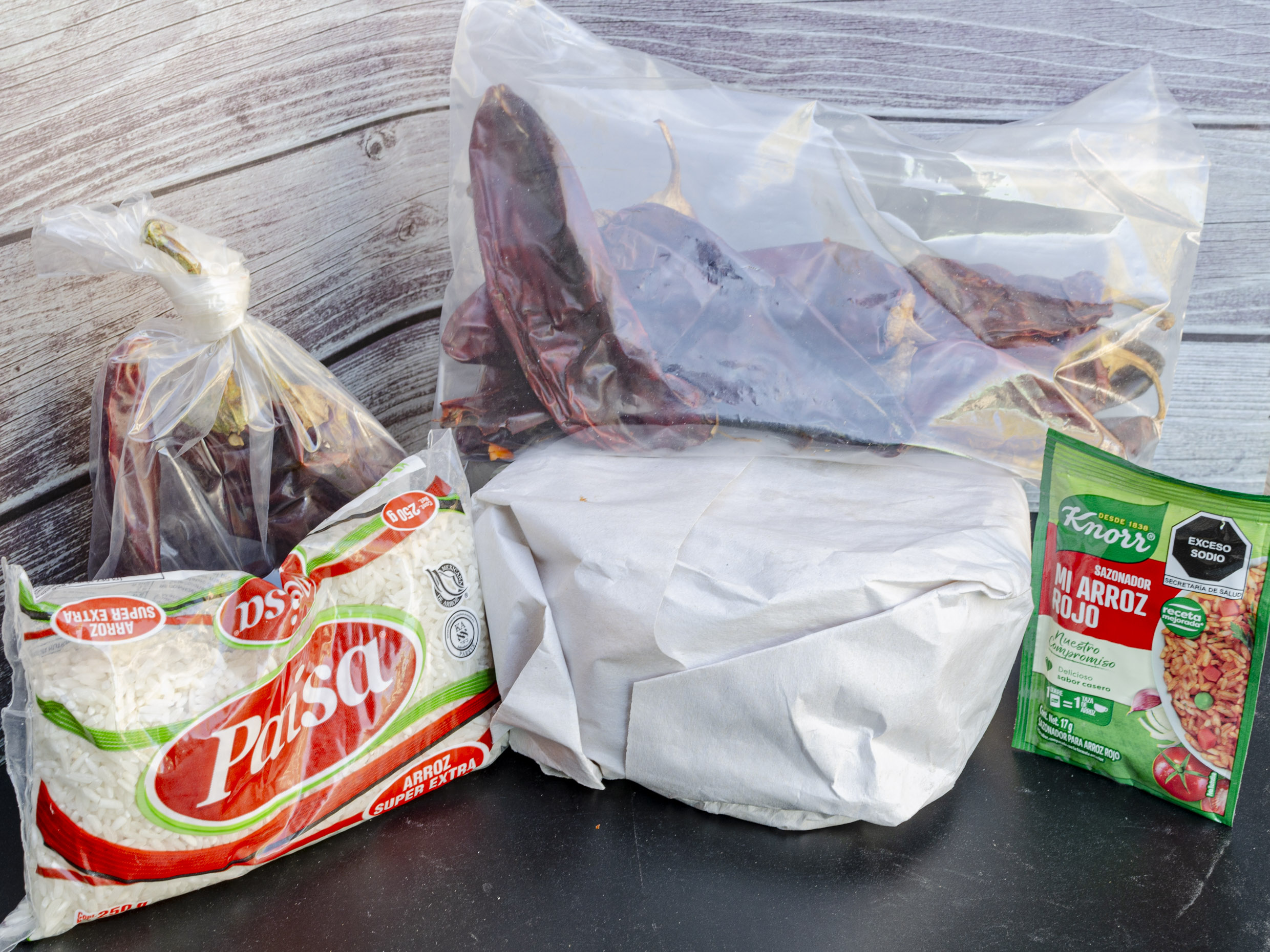 1 Paq. Tortillas de maíz, 500g Queso, 250g Arroz, 1 Mi arroz Rojo, .055 de Chile Mirasol, .075 de Chile Colorin