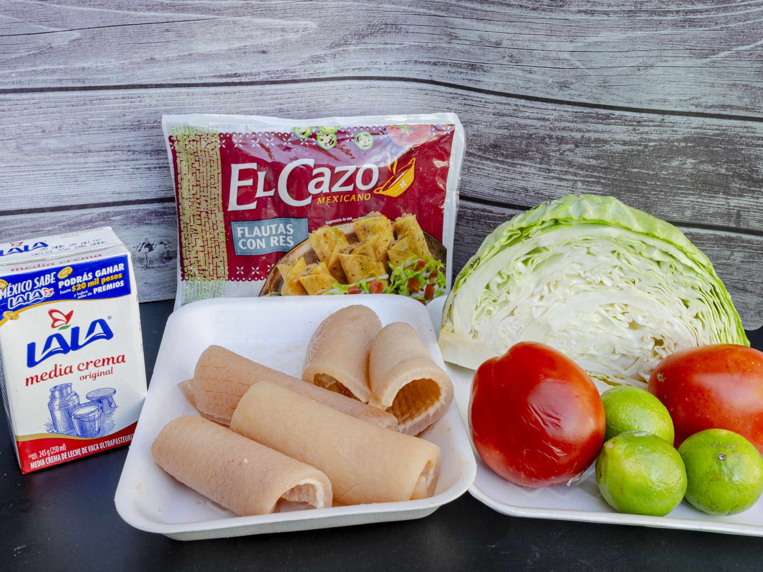 2 Paq. Flautas el cazo, 1 Media crema, ¼ Repollo, 5 Cueritos, 2 Tomates, 3 Limones