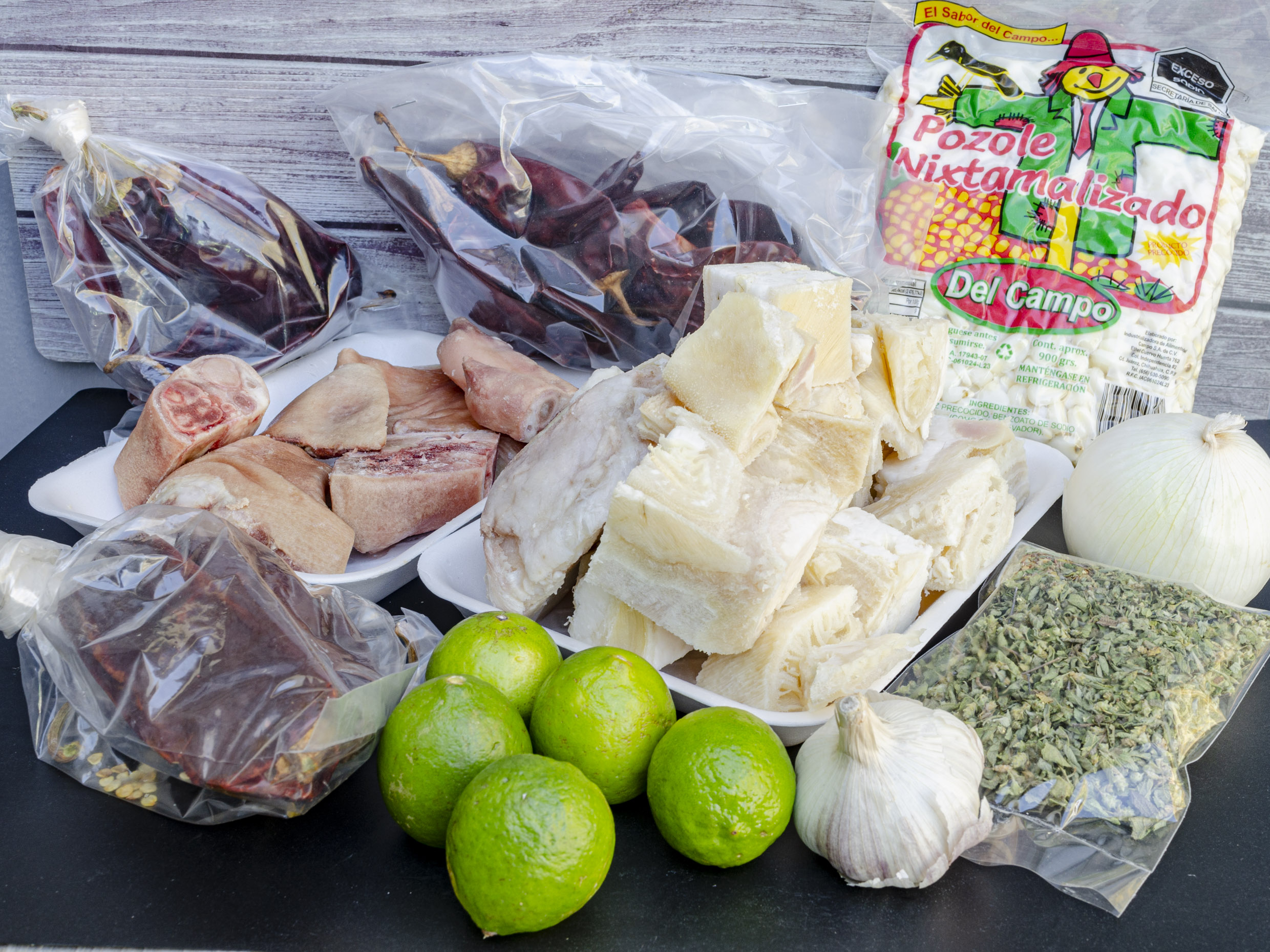 1kg Menudo, 500g Manita de Puerco, 1 Bolsa de Pozole, .090g Chile Mirasol, 116g Chile Colorin, 1 Cabeza de Ajo, .020g Oregano y 1 Cebolla