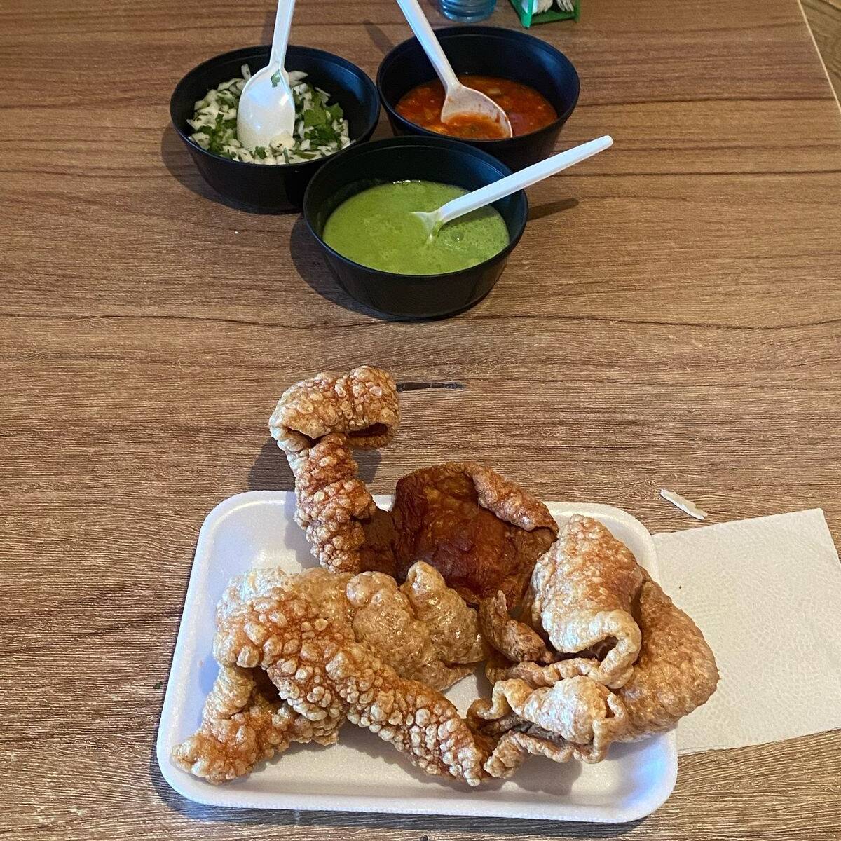 Medio kilo de chicharrón peya acompañado de salsa y tortillas