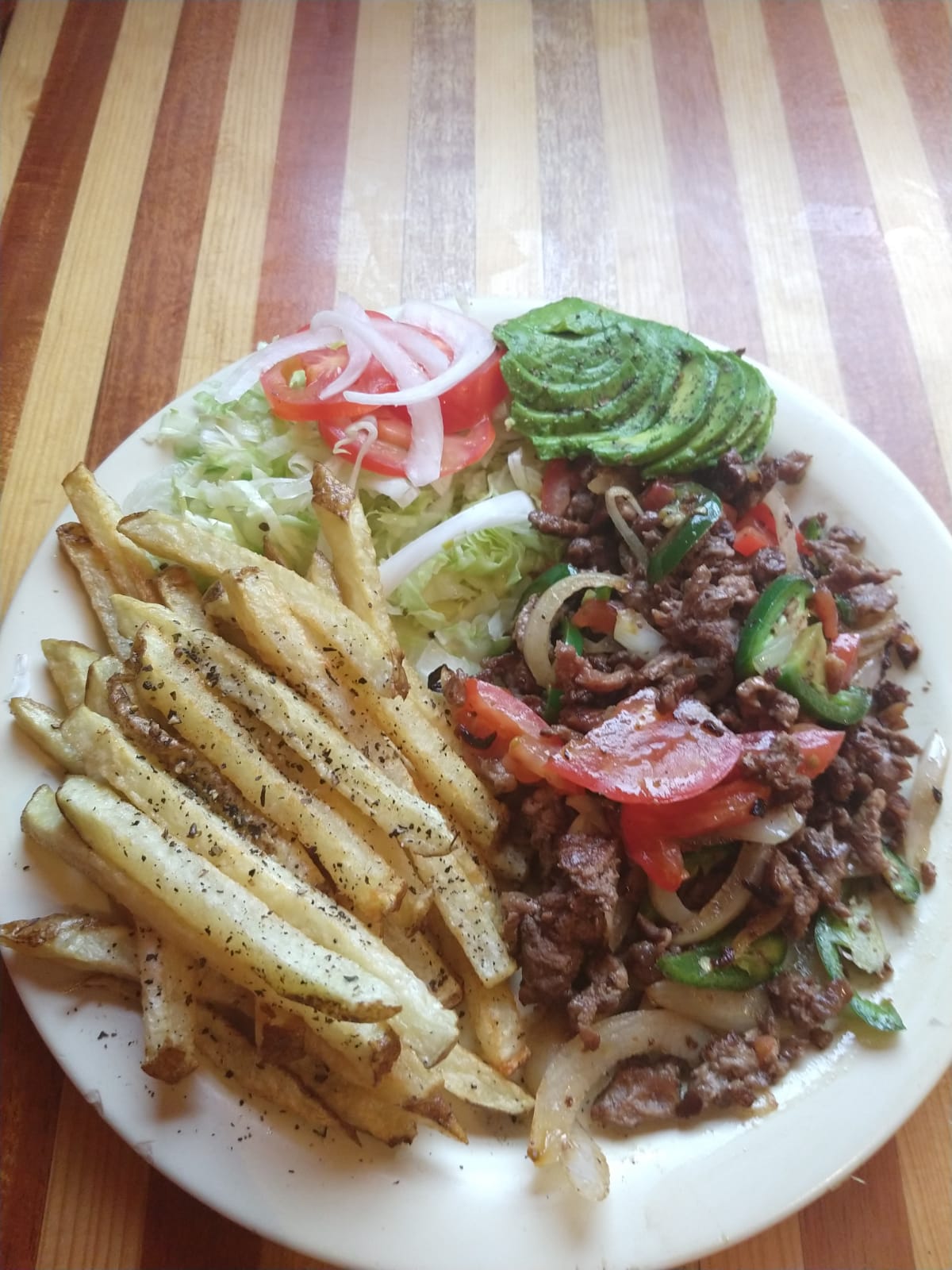 BISTECK ALA MEXICANA PREPARADO A LA PLANCHA , PAPAS FRITAS, AGUACATE , GUARNICION DE LECHUGA Y TOMATE
