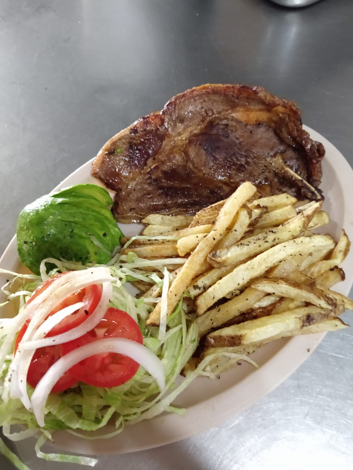 CHULETA DE RES ALA PLANCHA, PAPAS FRITAS, AGUACATE Y GUARNICION DE LECHUGA Y TOMATE