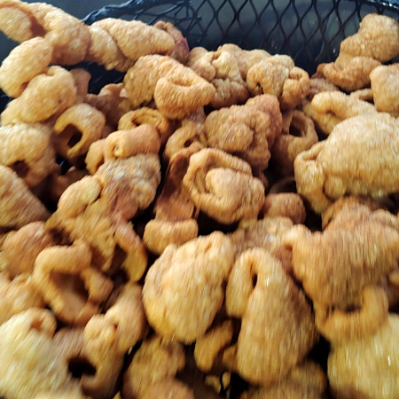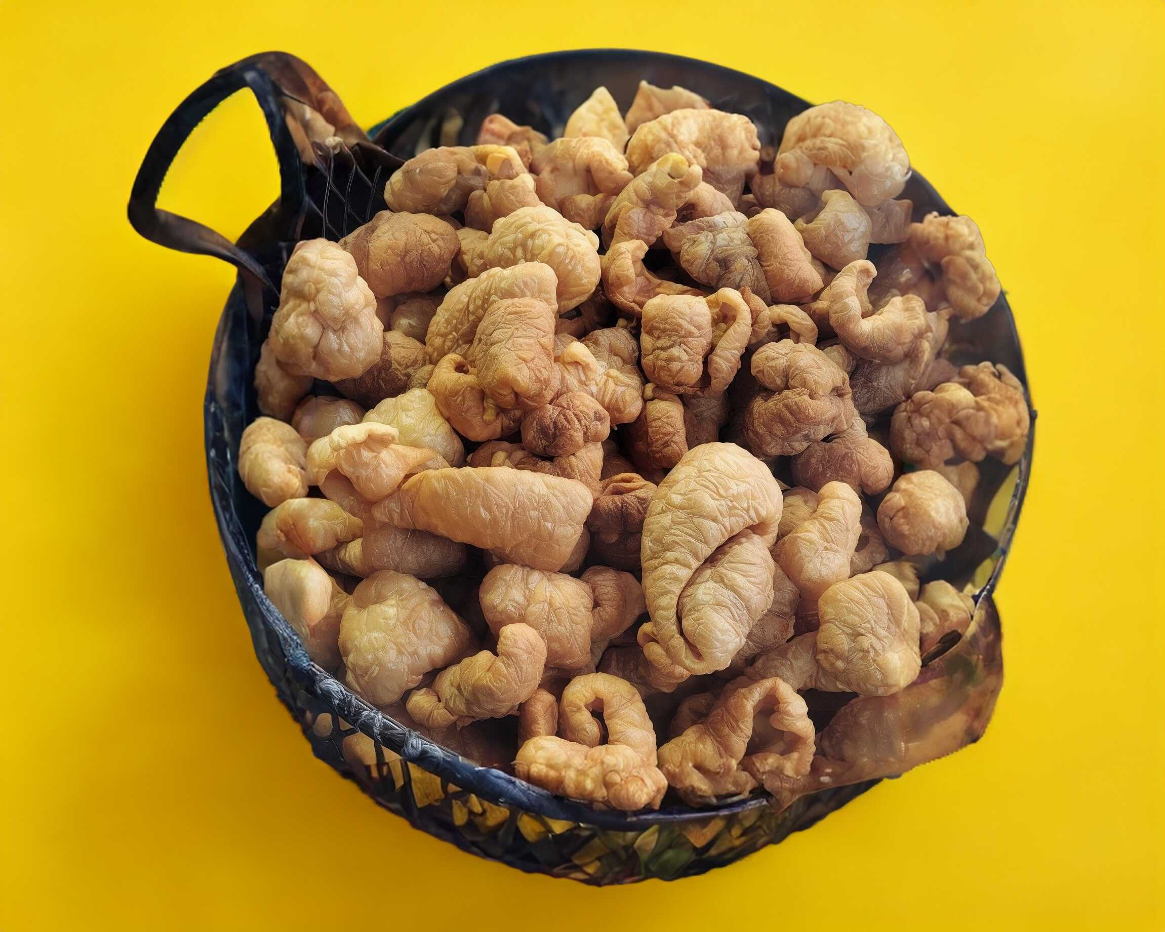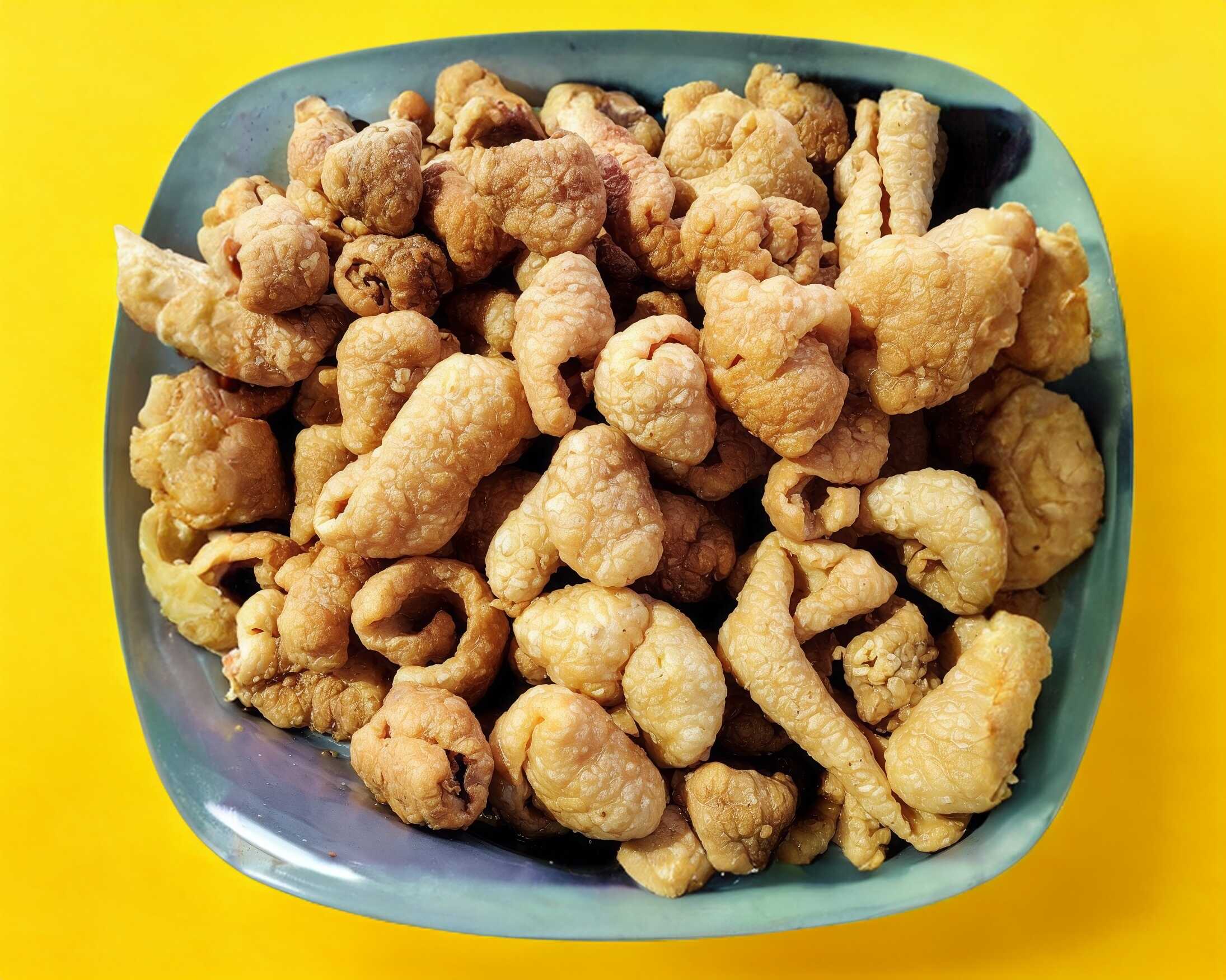 250 G de chicharron de peya y cuero acompañado de salsas y tortillas