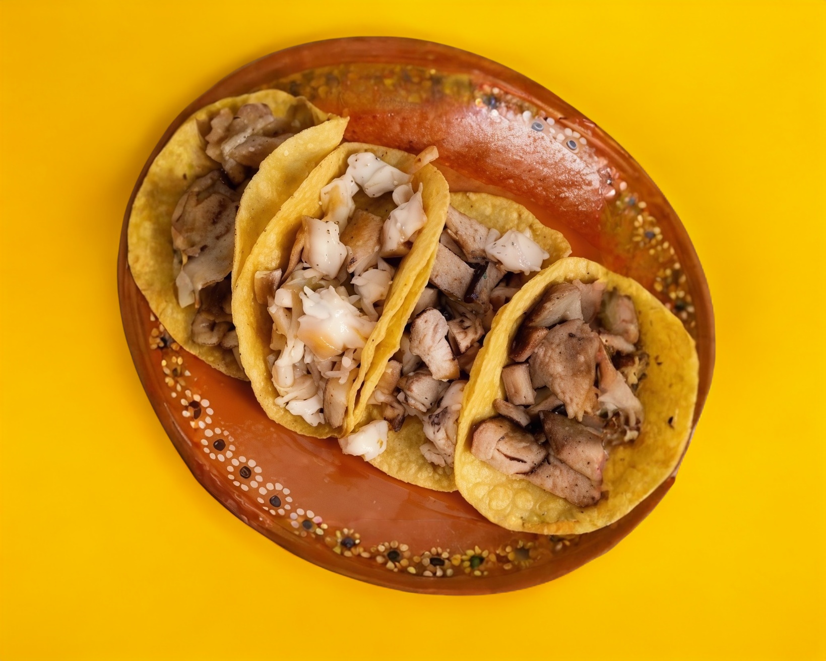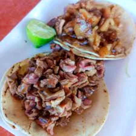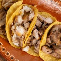 Tacos de carnita surtida con cuerito, acompañado de salsas cebolla, cilantro y limones