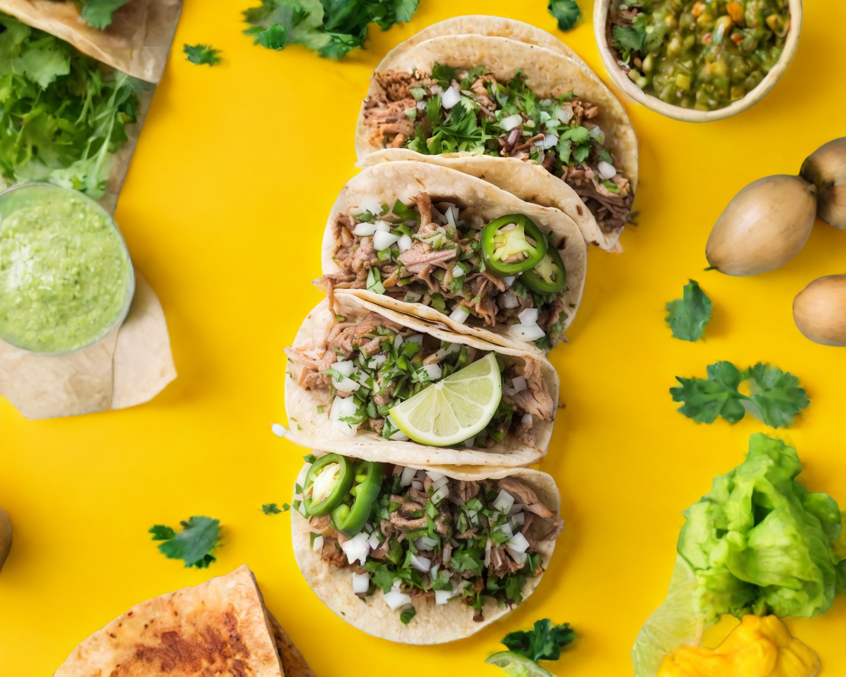 Deliciosos Tacos de Carnitas, acompañados de salsas, cebolla, cilantro, salsas y limones.