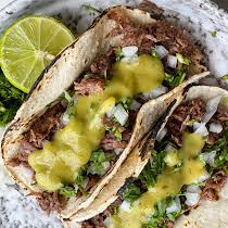 Deliciosos tacos de barbacoa acompañados de refresco de 200 ml.y Salsas, cebolla, cilantro y limones