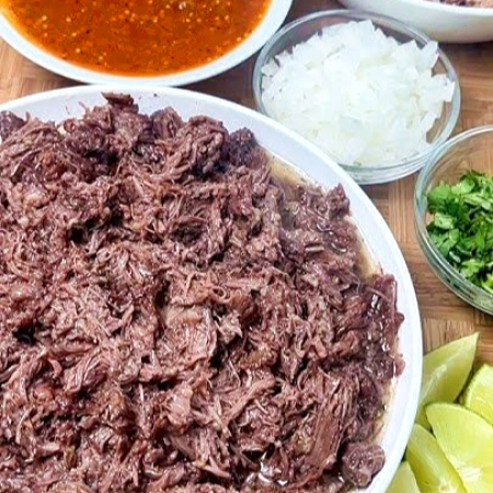 Kilo de deliciosa Barbacoa de res (labio) acompañadas de tortillas, Salsas, cebolla, cilantro y limones