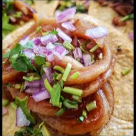 Deliciosos tacos de buche acompañados de salsas, cebolla, cilantro y limones