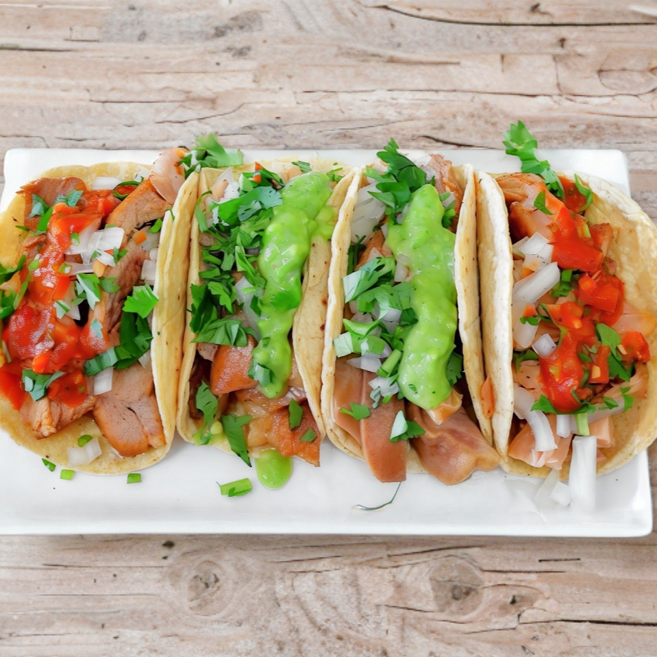 Orden con 4 tacos de surtida (pierna, chamorro, cuerito).