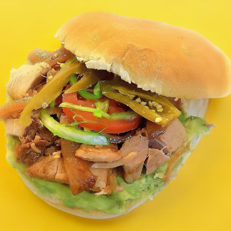 Torta de pierna (tomate, aguacate, cebolla,aderezo y mostaza)