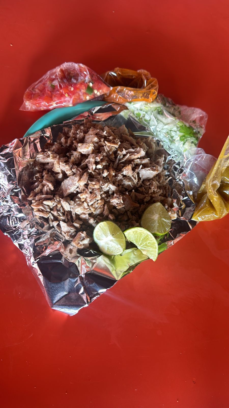 Incluye pierna, lomo, buche, tortilla, salsa, verdura y limón.