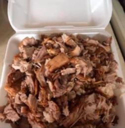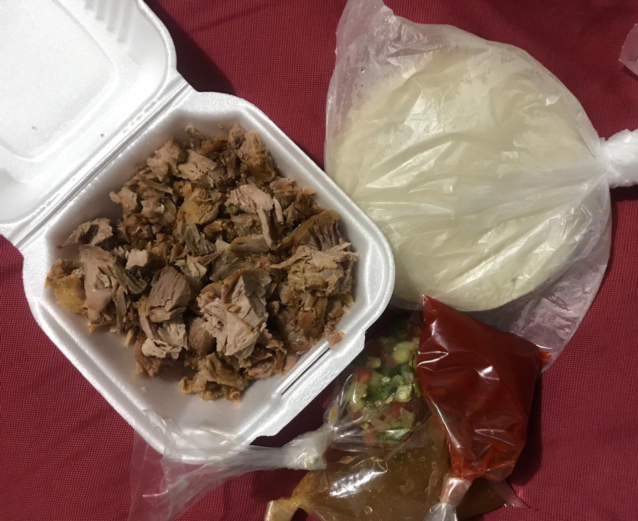 Un kilo de carnitas con cuerito, pico de gallo, salsa roja y verde, tortillas