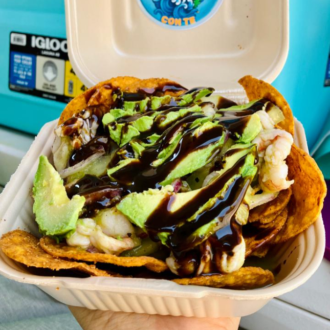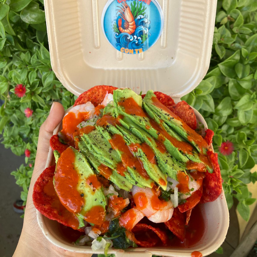 Tostitos con camarón cocido, cebolla y cilantro picados finamente, acompañados de aguacate, bañados en una deliciosa salsa de coctel y salsa de chile de árbol.