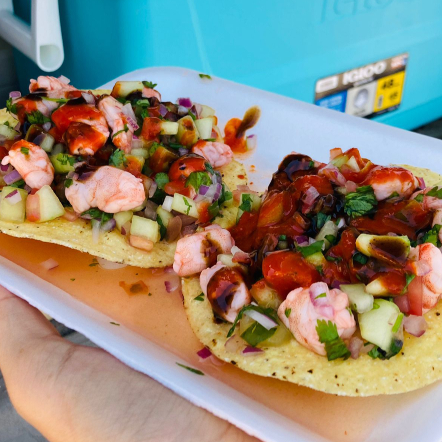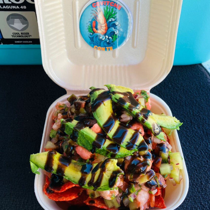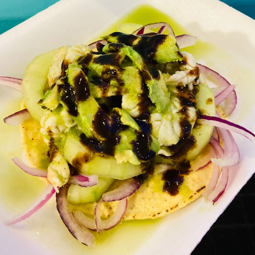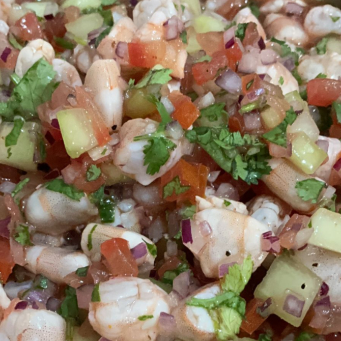 Crujiente base de tostada (2) cubierta con ceviche fresco de camarón, jitomate, cebolla, pepino y cilantro, acompañada de aguacate y un toque de salsa negra.
