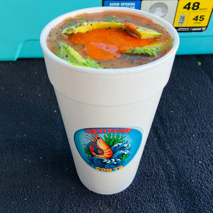 Grande (20oz) preparado con camarón cocido, jugo de limón, cebolla y cilantro finamente picados, sazonado con sal y pimienta, acompañado de aguacate fresco, salsa de chile de árbol y galletas saladas.