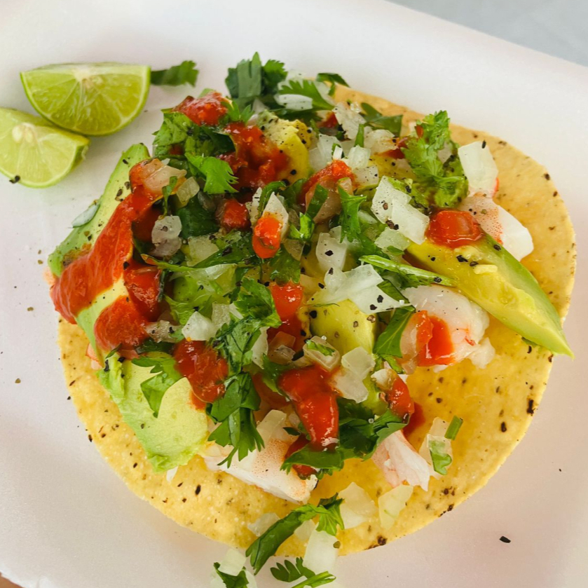 Crujiente tostada con camarón cocido, cebolla y cilantro picados finamente, acompañada de aguacate y un toque de salsa de chile de árbol.