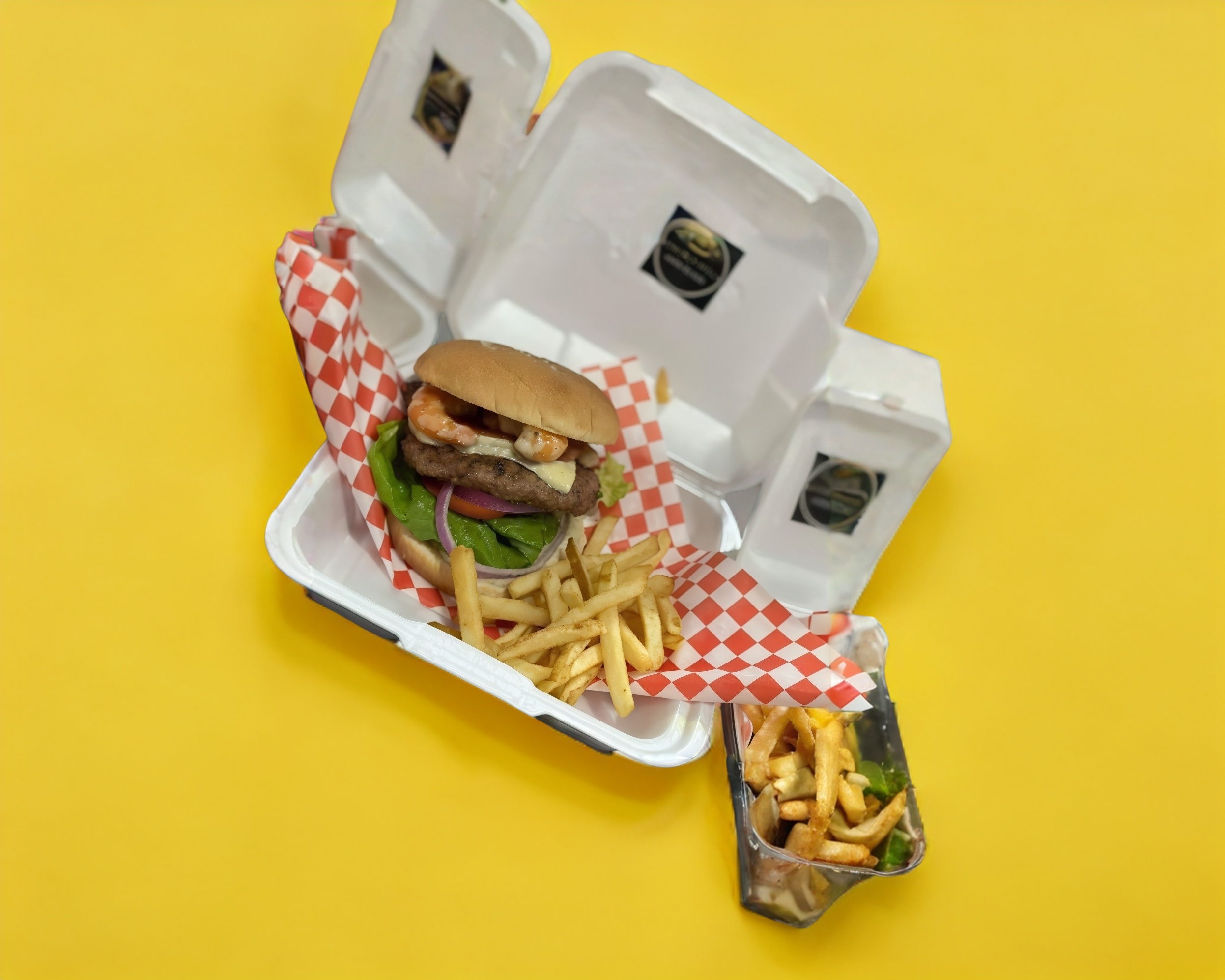 Carne arrachera, queso blanco, camarón en mantequilla, pan sin ajonjolí, líquidos, verduras y papas.