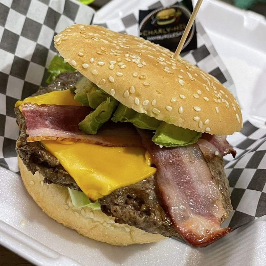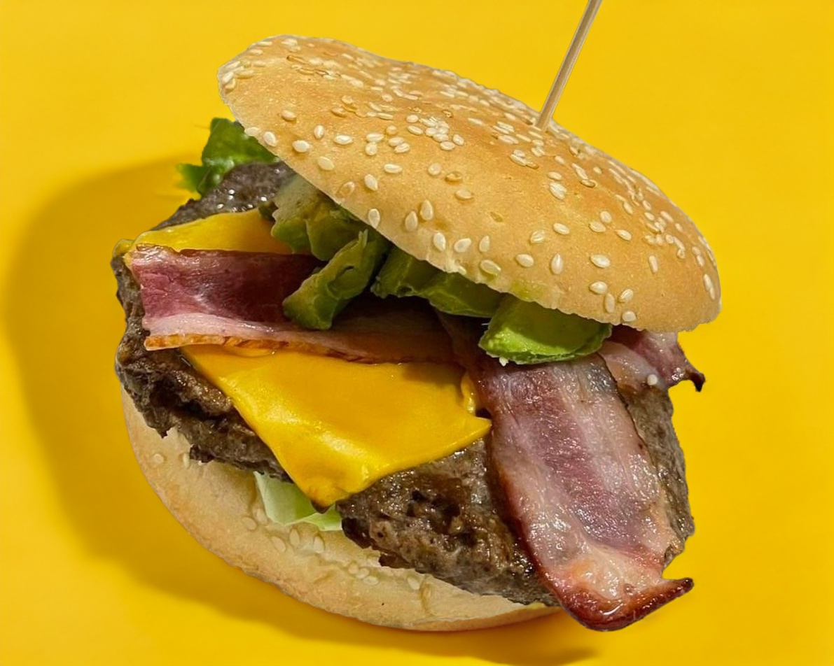 Carne arrachera, tocino, queso amarillo, aguacate, pan con ajonjolí, líquidos, verduras.